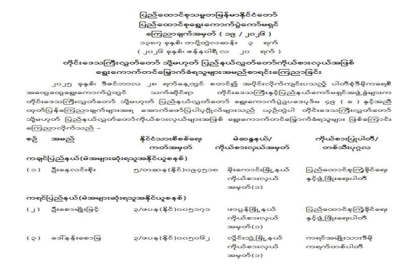 တိုင်းဒေသကြီးလွှတ်တော် သို့မဟုတ် ပြည်နယ်လွှတ်တော်ကိုယ်စားလှယ်အဖြစ် ရွေးကောက်တင်မြှောက်ခံရသူများ အမည်စာရင်းကြေညာခြင်း