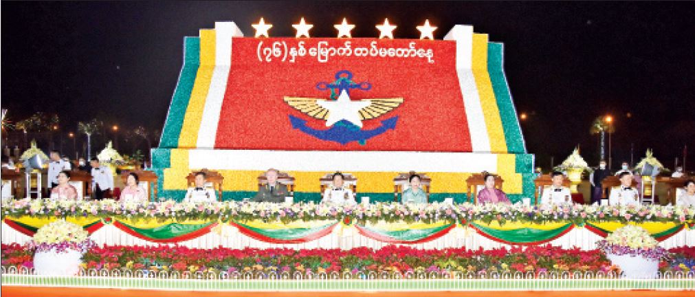 ၂၀၂၁ ခုနှစ်၊ (၇၆)နှစ်မြောက် တပ်မတော်နေ့ အထိမ်းအမှတ်ဧည့်ခံပွဲနှင့် ဂုဏ်ပြု ညစာစားပွဲအခမ်းအနားကို ယနေ့ညပိုင်းတွင် နေပြည်တော်ရှိ ဇေယျာသီရိဗိမာန် ဥပစာ ရင်ပြင်၌ ကျင်းပပြုလုပ်ရာ နိုင်ငံတော်စီမံအုပ်ချုပ်ရေးကောင်စီဥက္ကဋ္ဌ တပ်မတော် ကာကွယ်ရေးဦးစီးချုပ် ဗိုလ်ချုပ်မှူးကြီး မင်းအောင်လှိုင်နှင့် ဇနီး ဒေါ်ကြူကြူလှ တို့ တက်ရောက်ကြသည်။