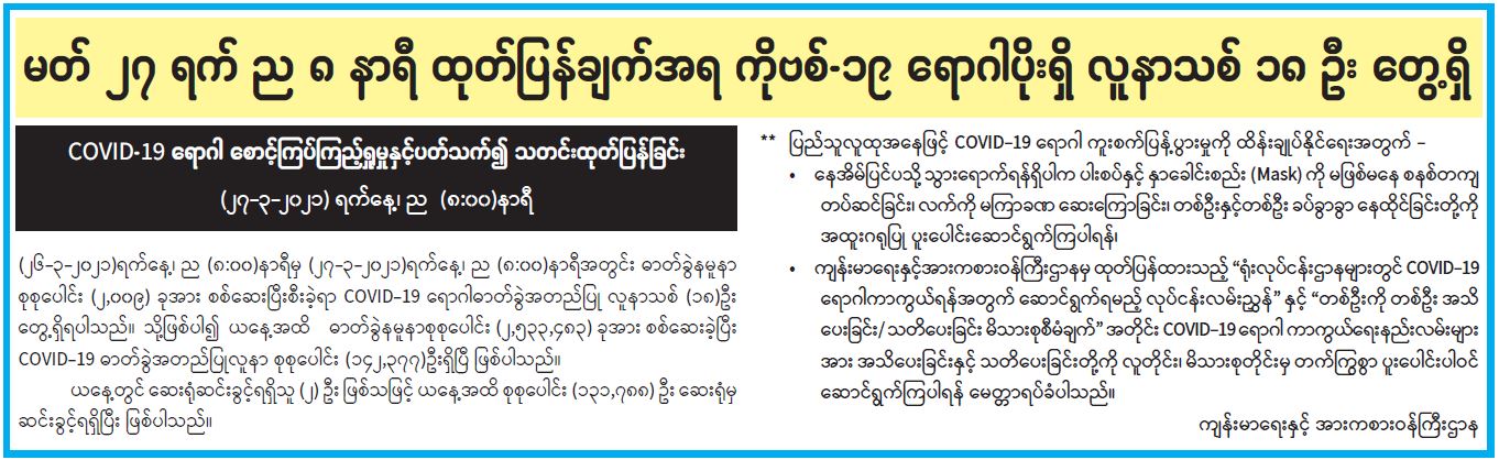 မတ် ၂၇ ရက် ည ၈ နာရီ ထုတ်ပြန်ချက်အရ ကိုဗစ်-၁၉ ရောဂါပိုးရှိ လူနာသစ် ၁၈ ဦး တွေ့ရှိ