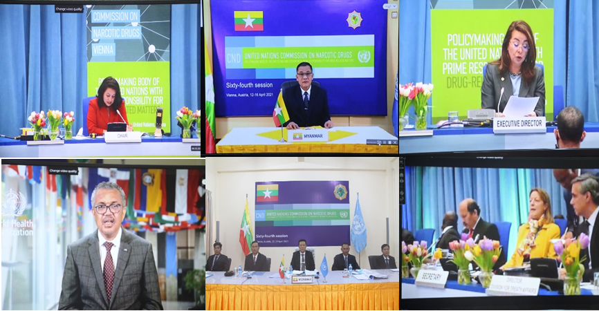 ပြည်ထဲရေးဝန်ကြီးဌာန၊ ဒုတိယဝန်ကြီး ဒုတိယဗိုလ်ချုပ်ကြီးသန်းလှိုင် ဦးဆောင်သော မြန်မာကိုယ်စားလှယ်အဖွဲ့သည် ဩစတြီးယားနိုင်ငံ၊ ဗီယင်နာမြို့၌ ဧပြီ ၁၂ ရက်မှ ၁၆ ရက်အထိ ကျင်းပသည့် (၆၄) ကြိမ်မြောက် မူးယစ်ဆေးဝါးကော်မရှင်အစည်းအဝေးသို့ ဗီဒီယိုကွန်ဖရင့် စနစ်ဖြင့် တက်ရောက်ခဲ့ကြသည်။