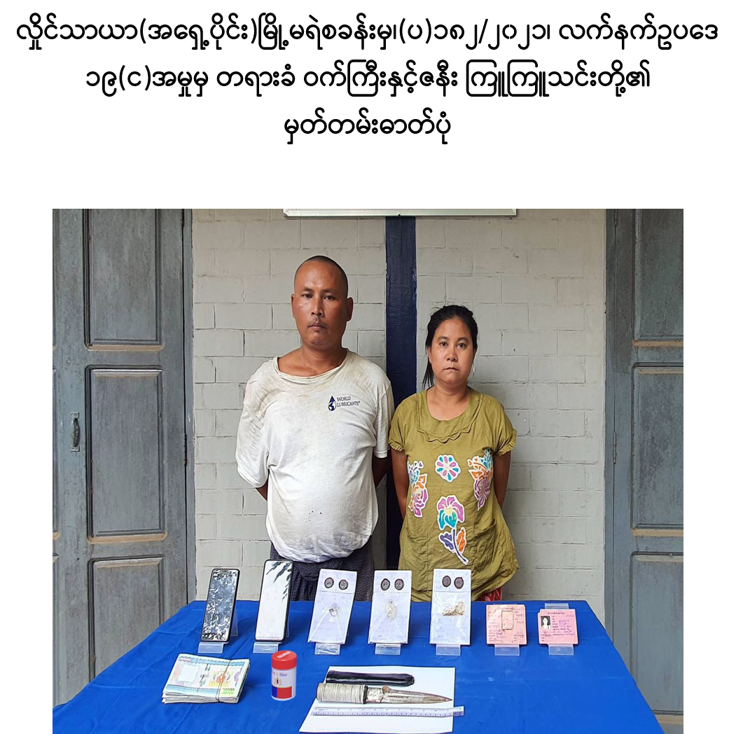 ရန်ကုန်တိုင်းဒေသကြီး၊ လှိုင်သာယာ(အရှေ့ပိုင်း)မြို့နယ်၊ အမှတ်(၇)ရက်ကွက်၊ အောင်မေတ္တာလမ်းနေ မဝင်းသန္တာဆွေ အား မတ် ၁၅ ရက်တွင် လှမျိုးအောင်(ခ) ကိုမျိုး(ခ)ဝက်ကြီး(ဘ)ဦးမြင့်လှိုင်၊ အောင်သူရဇော်(ခ)ကတုံး(ခ)သူရ(ဘ)ဦးအောင်ဇော်ဦး၊ အညာသား(ခ)မျိုးဇော်ထက်(ဘ)ဦးဝင်းခိုင်နှင့် မင်းခန့်(ခ)နှင်းကိုကို(ဘ)ဦးသောင်းတင် တို့သည် အရိုး/အသွား (၉)လက်မခန့်ရှိ ဓားဦးချွန်ဖြင် ထိုးခဲ့သဖြင့် အဆိုပါ မဝင်းသန္တာဆွေတွင် ၄ cm ခန့်အနက်ရှိ ယာရင်အုံထိုးသွင်းဒဏ်ရာ (၂)ချက်၊ ၁၂ cm ခန့်အနက်ရှိ ဝဲရင်အုံထိုးသွင်းဒဏ်ရာ (၄)ချက်၊ ၁၂ cm ဝဲခါးစောင်း ထိုးသွင်းဒဏ်ရာ များ ရရှိခဲ့ပြီး ဝဲရင်အုံးထိုးသွင်းဒဏ်ရာမှာ အဆုတ်ထိရောက်ပြီး ရင်ခေါင်းအတွင်း သွေးယို၍ သေဆုံး ခဲ့ခြင်းဖြင့် တစ်ဦးထက်ပိုသောသူမျာက အကြံတူတစ်ခုကို အထမြောက်စေရန် ပြုလုပ်သည်ခဲ့ သည့်ပြစ်မှုကို ကျူးလွန်ခဲ့သည့်အတွက် စစ်အုပ်ချုပ် ရေး (Martial Law)စစ်ခုံရုံးဖွဲ့၍ စစ်ဆေးမှုများ ဆောင်ရွက်ခဲ့ရာ ရာဇသတ်ကြီး ပုဒ်မ-၃၀၂ (၁)(ခ)/၃၄ အရ ဧပြီ ၁၂ ရက်တွင် “ သေဒဏ် ” အမိန့်ကို လည်းကောင်း၊ တင်ထွန်းအောင်(ခ)မိုးလျှံ(ဘ)ဦးထွန်းဆန်း၊ ဒေါ်မြင့်မြင့်အေး(ဘ)ဦးငွေငြိမ်း နှင့် ဒေါ်တင်တင်အေး(ဘ)ဦးငွေငြိမ်းတို့သည် မဝင်းသန္တာဆွေ အား မတ် ၁၅ ရက်တွင် လှမျိုးအောင်(ခ)ကိုမျိုး(ခ)ဝက်ကြီးနှင့် အောင်သူရဇော်(ခ)ကတုံး(ခ)သူရ တို့က အရိုး/ အသွား (၉)လက်မခန့်ရှိ ဓားဦးချွန်ဖြင် ထိုးခဲ့သဖြင့် သေဆုံးမှုဖြစ်စဉ်တွင် မဝင်းသန္တာဆွေ အား သူလျှို၊ ဒလန်၊ သတင်းပေးဟု စွပ်စွဲကာ သောင်ကြီး ဘုန်းကြီးကျောင်းသို့ ခေါ်ယူစစ်ဆေးမေးမြန်းခြင်း၊ မဝင်းသန္တဆွေ၏ နေအိမ်အား အပြင်ဘက်မှသော့ပိတ်ကာ သော့နှင့် လက်ကိုင်ဖုန်း(၂)လုံးအား သိမ်းဆည်းထား ရှိခဲ့ခြင်း၊ လှမျိုးအောင်(ခ)ကိုမျိုး(ခ)ဝက်ကြီး မှ မဝင်းသန္တာဆေွ အား ခေါ်ဆောင်သွား ရန် သော့အား လာရောက်တောင်းယူစဉ် ပေးအပ်ခဲ့ခြင်းဖြင့် မဝင်းသန္တာဆွေ အား သတ်ရန် အားပေးကူညီမှုကို ပြုလုပ်ခဲ့သည့် ပြစ်မှုကို ကျူးလွန်ခဲ့သည့်အတွက် စစ်အုပ်ချုပ်ရေး (Martial Law)စစ်ခုံရုံးဖွဲ့၍ စစ်ဆေးမှုများ ဆောင်ရွက်ခဲ့ရာ ရာဇသတ်ကြီး ပုဒ်မ-၃၀၂ (၁)(ခ)/၁၀၉ အရ ဧပြီ ၁၂ ရက်တွင် “ သေဒဏ် ”အမိန့်ကို လည်းကောင်း၊ စိုးကြီး(ခ)စိုးပိုင်(ဘ)ဦးလှစော သည် ဧရာဝတီတိုင်းဒေသကြီး၊ ကျောင်းကုန်းမြို့၌ မတ် ၁၆ ရက်နေ့ ည ၈ နာရီအချိန်ခန့်တွင် လှမျိုးအောင်(ခ) ကိုမျိုး(ခ)ဝက်ကြီးနှင့် မကြူကြူသင်း တို့အား လှိုင်သာယာ(အရှေ့ပိုင်း)မြို့နယ်၊ အမှတ်(၇)ရပ်ကွက်၊ အောင်မေတ္တာလမ်းနေ မဝင်းသန္တာဆွေ အား လူသတ်မှုကျူးလွန်ခဲ့သဖြင့် ဖမ်းဆီးစေရန် အမိန့်ထုတ်ပြန်ထားပြီး ထွက်ပြေးနေသည်ကို သိလျက်နှင့် ဖမ်းဆီးခြင်းမှ ကာကွယ်ရန်အကြံဖြင့် လက်သင့်ခံမှုကို ပြုလုပ်ခဲ့သည့် ပြစ်မှု