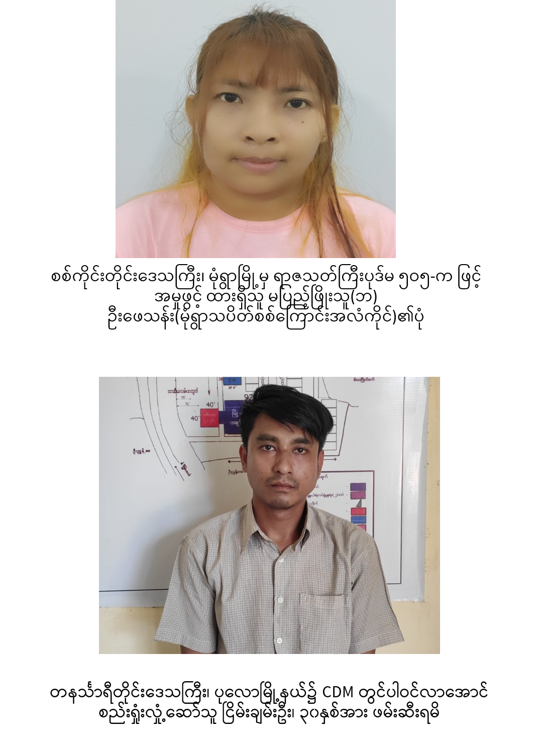 အလားတူ မန္တလေးတိုင်းဒေသကြီး၊ မြစ်ငယ်မြို့၊ မြစ်ငယ်မီးရထားစက်ရုံမှ လက်ထောက်အင်ဂျင်နီယာအဖြစ် တာဝန်ထမ်းဆောင်နေသည့် ဦးဌေးလင်း(ဘ) ဦးအောင်မြင့်သည် ၎င်းကိုယ်တိုင် CDM လှုပ်ရှားမှုတွင်ပါဝင်ခြင်းနှင့် တာဝန် ထမ်းဆောင်နေသည့်ဝန်ထမ်းများအား လိုက်လံစည်းရုံးခြင်း၊ လူမှုကွန်ယက် စာမျက်နှာပေါ်တွင် လှုံဆော်စာများရေးသားခြင်း၊ CDM လှုပ်ရှားမှုတွင် ပါဝင်ခြင်း မရှိသည့် ဝန်ထမ်းများအား ဖိအားပေးခြိမ်းခြောက်ခြင်း၊ လှုံ့ဆော်ခြင်းများ ဆောင်ရွက်ခဲ့သဖြင့် မြစ်သားမြို့မရဲစခန်း၌ ရာဇသတ်ကြီးပုဒ်မ၅၀၅-က(ဂ)ဖြင့် အမှုဖွင့်လှစ်ထားရှိရာ ယနေ့နေ့လယ်ပိုင်းတွင် ၎င်းပုန်းရှောင်နေသည့် မြစ်သားမြို့နယ်၊ ဉယျာဉ်တော်ကျေးရွာအုပ်စု၊ သာယာအေးကျေးရွာ၊ ကျောင်းသစ်ကျောင်း ဘုန်းတော် ကြီးကျောင်းဝန်းအတွင်း၌ ဖမ်းဆီးရမိခဲ့ပြီး ဉပဒေနှင့်အညီ အရေးယူနိုင်ရေး လုပ်ထုံး လုပ်နည်းများနှင့်အညီ ဆက်လက်ဆောင်ရွက်လျက်ရှိသည်။