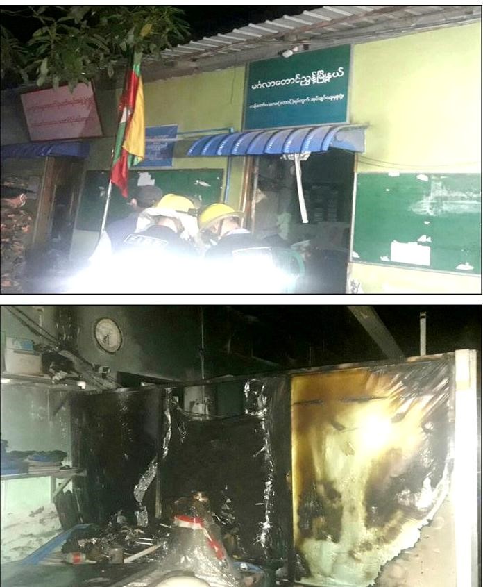 အလားတူ နံနက် ၅ နာရီခွဲအချိန်တွင် သန်လျင်မြို့နယ်၊ အမှုထမ်းရပ်ကွက်၊ ရပ်ကွက်စီမံအုပ် ချုပ်ရေးအဖွဲ့ရုံး မီးလောင်နေကြောင်းသတင်းအရ လုံခြုံရေးတပ်ဖွဲ့ဝင်များနှင့် မီးသတ်တပ်ဖွဲ့ဝင်များ က သွားရောက်မီးငြှိမ်းသတ်ခဲ့ရာ နံနက် ၅ နာရီ ၄၀ မိနစ်အချိန်တွင် မီးငြိမ်းသွားခဲ့ပြီး မီးလောင်မှု ကြောင့် ရုံးတွင်ချိတ်ဆွဲထားသော ဗီနိုင်း ၁ ခု မီးလောင်ပျက်စီးဆုံးရှုံးခဲ့ပြီး လုံခြုံရေးတပ်ဖွဲ့ဝင်များက မီးလောင်မှုနှင့်ပတ်သက်၍ စိစစ်ခဲ့ရာ အဆိုပါရုံးပတ်လည်တွင် အကြမ်းဖက်သူလူတစ်စုမှ ဒီဇယ်ဆီ များပတ်ဖြန်းထားပြီး ရုံးဝင်းအတွင်းရှိ အမှိုက်ပုံများအား စုပုံမီးရှို့ထားခဲ့ခြင်းဖြစ်ကြောင်း သိရသည်။