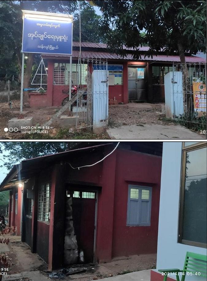ထိုသို့လုပ်ဆောင်ရာတွင် ၂၀၂၁ ခုနှစ်၊ ဧပြီလ ၁၃ ရက် ညနေ ၃ နာရီအချိန်တွင် တောင်ဥက္ကလာပ မြို့နယ်၊ အမှတ်(၁၄)ရပ်ကွက်၊ ရပ်ကွက်စီမံအုပ်ချုပ်ရေးရုံးအား အကြမ်းဖက်သူ အမျိုးသား ၄ ဦး က မီးပုလင်းဖြင့် ပစ်ပေါက်ခဲ့ရာ အဆိုပါမီးပုလင်းများမှာ ရပ်ကွက်စီမံအုပ်ချုပ်ရေးရုံး အမိုးပေါ်ကျရောက် ပေါက်ကွဲ၍ မီးလောင်နေကြောင်း သတင်းအရ လုံခြုံရေးတပ်ဖွဲ့ဝင်များပါဝင်သော ပူးပေါင်းအဖွဲ့မှ သွားရောက်၍ ရပ်ကွက်နေပြည်သူများနှင့် ပူးပေါင်း၍ မီးငြှိမ်းသတ်ခဲ့ရာ ညနေ ၃ နာရီ ၁၅ မိနစ် အချိန်တွင်မီးငြိမ်းသွားခဲ့ပြီး မီးလောင်မှုကြောင့် အဆိုပါရုံးအမိုးအနည်းငယ် မီးလောင်ဆုံးရှုံးခဲ့ကြောင်း သိရသည်။