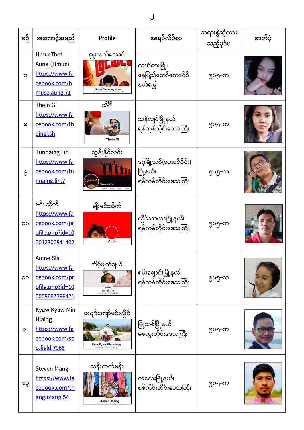 နိုင်ငံတော်၏ အုပ်ချုပ်မှုယန္တရားပျက်ပြားစေရန်ရည်ရွက်ချက်ဖြင့် နိုင်ငံ့ဝန်ထမ်းများအား CDM လှုပ်ရှားမှုတွင် ပါဝင်စေရန်လှုံ့ဆော်ခြင်း၊ CRPH မတရားအသင်းအား ထောက်ခံသည့် အကြောင်းအရာများ၊ မမှန်သတင်းများအားဖြန့်ဝေခြင်း၊ နိုင်ငံတော်တည်ငြိမ်အေးချမ်းမှုကို ပျက်ပြားစေပြီး ဆူပူအုံကြွမှုဖြစ်ပေါ်စေရန်နှင့် အများပြည်သူအထိတ်တလန့်ဖြစ်စေရန် အတွက် သွေးထိုးလှုံ့ဆော်မှုများပြုလုပ်ခြင်း၊ Social Pumishment ပြုလုပ်ခြင်းများကို လူမှုကွန်ရက် စာမျက်နှာများတွင် ရည်ရွယ်ချက်ရှိရှိ ဖြင့်ဖော်ပြခြင်းနှင့် ဖြန့်ဝေခြင်းများ ဆောင်ရွက် လျက်ရှိသည့် အောက်ဖော်ပြပါ အနုပညာရှင်အချို့နှင့် အခြားပါဝင်ပတ်သက်သူများအား ရာဇသတ်ကြီးပုဒ်မ ၅၀၅-က ဖြင့် အမှုဖွင့်အရေးယူ ဆောင်ရွက်လျက်ရှိသည်။