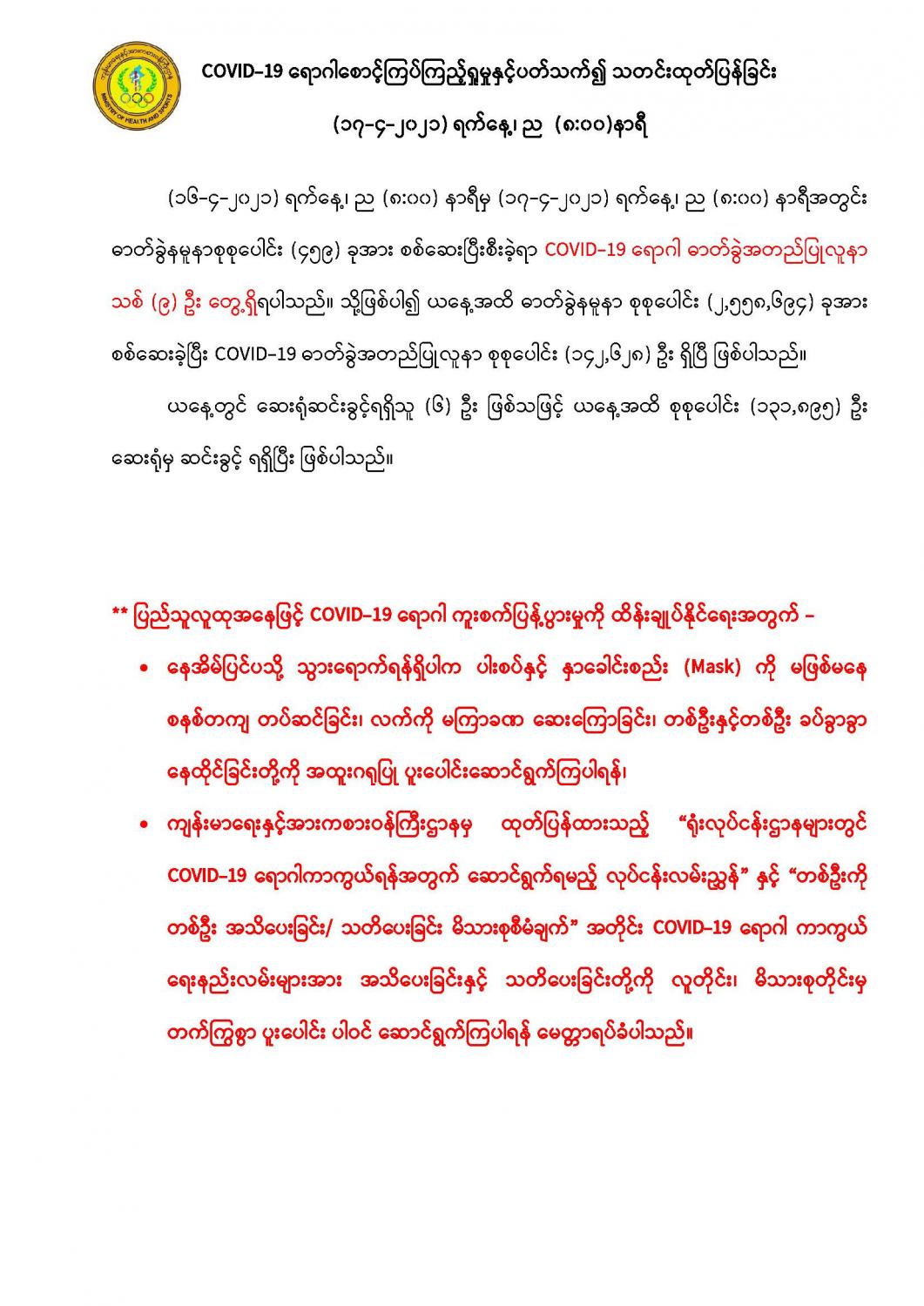 COVID-19 ရောဂါစောင့်ကြပ်ကြည့်ရှုမှုနှင့်ပတ်သက်၍ သတင်းထုတ်ပြန်ခြင်း (၁၇-၄-၂၀၂၁) ရက်နေ့၊ ည (၈:၀၀)နာရီ 04/17/2021 နေပြည်တော်