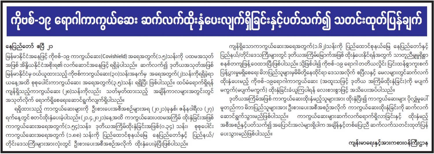 ကိုဗစ်-၁၉ ရောဂါကာကွယ်ဆေး ဆက်လက်ထိုးနှံပေးလျက်ရှိခြင်းနှင့်ပတ်သက်၍ သတင်းထုတ်ပြန်ချက်