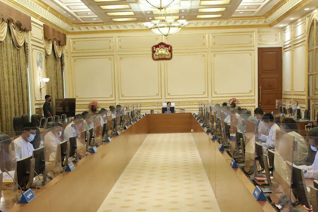 နိုင်ငံတော်စီမံအုပ်ချုပ်ရေးကောင်စီ စီမံခန့်ခွဲရေးကော်မတီ အစည်းအဝေး (၅/၂၀၂၁)ကို ယနေ့မွန်းလွဲပိုင်းတွင် နေပြည်တော်ရှိ နိုင်ငံတော်စီမံအုပ်ချုပ်ရေး ကောင်စီဥက္ကဋ္ဌရုံး အစည်းအဝေး ခန်းမ၌ကျင်းပရာ နိုင်ငံတော် စီမံအုပ်ချုပ်ရေး ကောင်စီဥက္ကဋ္ဌ၊ တပ်မတော်ကာကွယ်ရေးဦးစီးချုပ် ဗိုလ်ချုပ်မှူးကြီးမင်းအောင်လှိုင် တက်ရောက် အမှာစကားပြောကြားသည်။