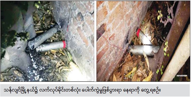 မေ ၉ ရက် ည ၁၀ နာရီခွဲအချိန်တွင် မန္တလေးတိုင်းဒေသကြီး၊ ကျောက်ဆည်မြို့နယ်၊ ရဲဘော်လေးကျေးရွာနေ ဦးရွှေဘ(၅၁)နှစ် နေအိမ်ခြံဝင်းအတွင်း၌ လည်းကောင်း၊ ယနေ့နံနက် ၁ နာရီ ၁၅ မိနစ်ခန့်တွင် ကယားပြည်နယ်၊ လွိုင်ကော်မြို့၊ မင်္ဂလာရပ်ကွက်ရှိ မိုးကောင်းဘုရား အရှေ့ဘက် “သော်တာစန်းလက်” ထမင်းဆိုင်ရှေ့၌လည်းကောင်း၊ နံနက် ၈ နာရီခွဲခန့်တွင် လွိုင်ကော်မြို့၊ မင်္ဂလာရပ်ကွက်ရှိ ကန္ဒရဝတီလမ်းမကြီးရှိ တောင်ကွဲစေတီ၏ မုခ်ဦးတံခါးမကြီး အနီး ၌လည်းကောင်း အကြမ်းဖက်သူများထောင်ထားသည့် လက်ပစ်ဗုံးများ၊ လက်လုပ်မိုင်း များအား တွေ့ရှိခဲ့သဖြင့် လုံခြုံရေးတပ်ဖွဲ့ဝင်များက အများပြည်သူအန္တရာယ်မဖြစ်စေရေး သက်မဲ့ပြုလုပ်သိမ်း ဆည်းခဲ့သည်။