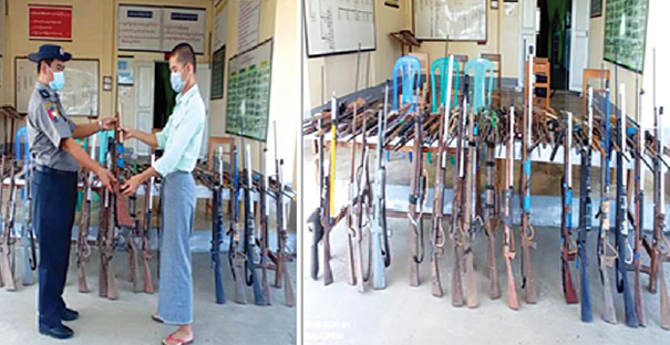 မြို့နယ်အချို့၌ လက်နက်ကိုင်ဆောင်လိုခြင်းမရှိသည့် ပြည်သူလူထုမှ လက်လုပ်သေနတ်နှင့် တူမီးသေနတ်များ အား အုပ်ချုပ်ရေး တာဝန်ရှိသူများမှတစ်ဆင့် လုံခြုံရေးတပ်ဖွဲ့ဝင်များထံ လာရောက်အပ်နှံ