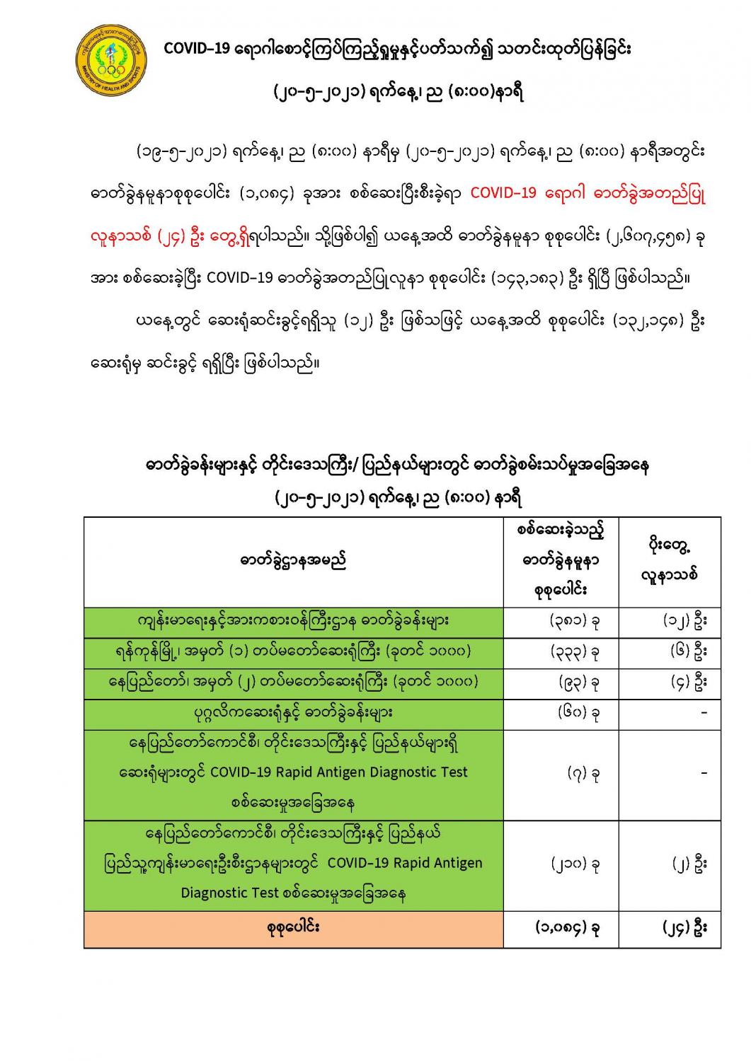 COVID-19 ရောဂါစောင့်ကြပ်ကြည့်ရှုမှုနှင့်ပတ်သက်၍ သတင်းထုတ်ပြန်ခြင်း (၂၀-၅-၂၀၂၁) ရက်နေ့၊ ည (၈:၀၀)နာရီ 05/20/2021