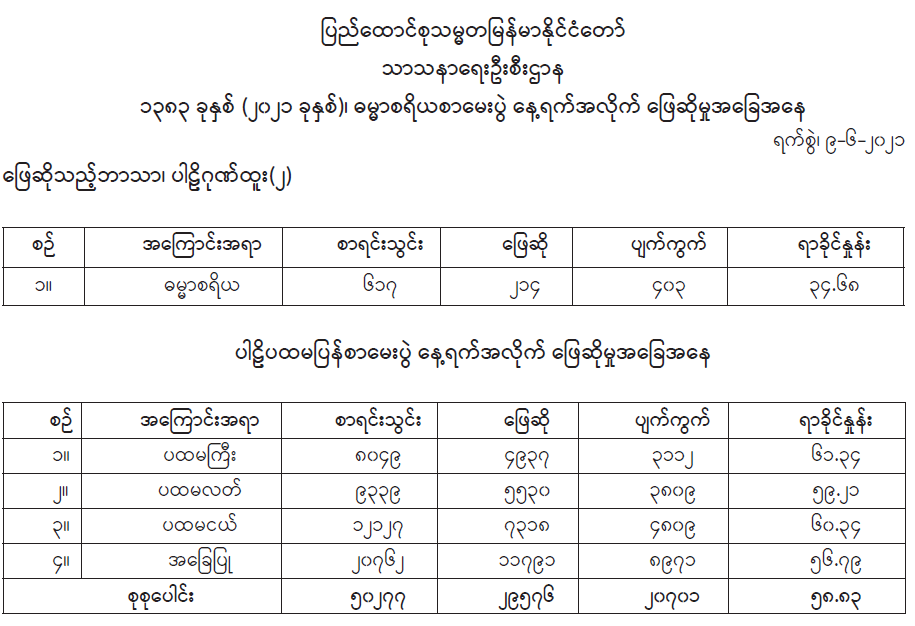 ဓမ္မာစရိယစာမေးပွဲနဝမနေ့ စာရင်းသွင်းသံဃာနှင့် သီလရှင် စုစုပေါင်း ၆၁၇ ပါးအနက် ၂၁၄ ပါး ဖြေဆိုကြသဖြင့် ၃၄ ဒသမ ၆၈ ရာခိုင်နှုန်း ဖြေဆိုကြပြီး ပါဠိပထမပြန်စာမေးပွဲ (ပထမကြီး၊ | ပထမလတ်၊ ပထမငယ်၊ အခြေပြုမူလတန်း) တတိယနေ့ကို စာရင်းသွင်းသံဃာနှင့် သီလရှင် စုစုပေါင်း ၅၀၂၇၇ ပါးအနက် ၂၉၅၇၆ ပါး ဖြေဆိုကြသဖြင့် ၅၈ ဒသမ ၈၃ ရာခိုင်နှုန်း ဖြေဆို ကြကြောင်း သာသနာရေးဦးစီးဌာနမှ သိရသည်။