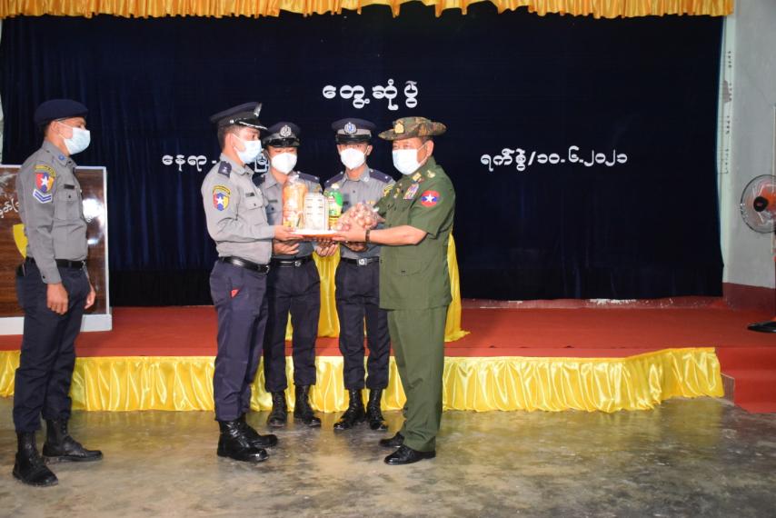 ပြည်ထောင်စုဝန်ကြီး ဒုတိယဗိုလ်ချုပ်ကြီးစိုးထွဋ် ပဲခူးမြို့ နယ်မြေခံလုံခြုံရေး ရဲတပ်ဖွဲ့ခွဲရှိ တပ်ဖွဲ့ဝင်နှင့် မိသားစုများအား တွေ့ဆုံအားပေး စားသောက်ဖွယ်ရာများ ထောက်ပံ့