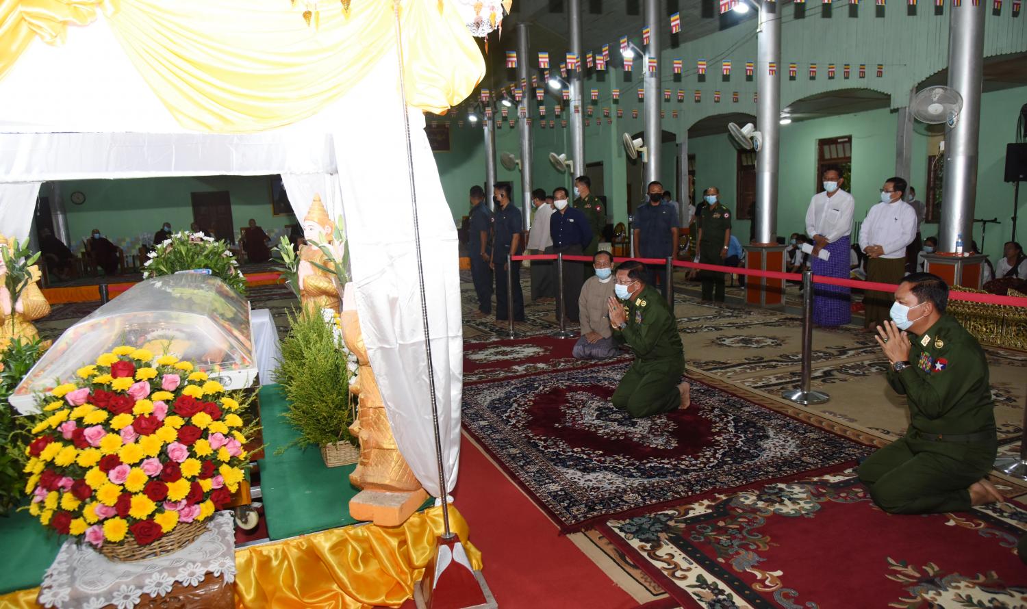 ဦးစွာ နိုင်ငံတော်စီမံအုပ်ချုပ်ရေးကောင်စီဥက္ကဋ္ဌ တပ်မတော်ကာကွယ်ရေးဦးစီးချုပ် ဗိုလ်ချုပ်မှူးကြီး မင်းအောင်လှိုင် သည် ဈေကုန်းကျောင်းတိုက် ရွှေရတုဗိမာန် စံကျောင်းတော်အတွင်း အပူဇော်ခံထားရှိသည့် ဈေးကုန်းဆရာတော်ဘုရားကြီး၏ ရုပ်ကလာပ်တော်အား ဂါရဝပြုဖူးမြော်သည်။