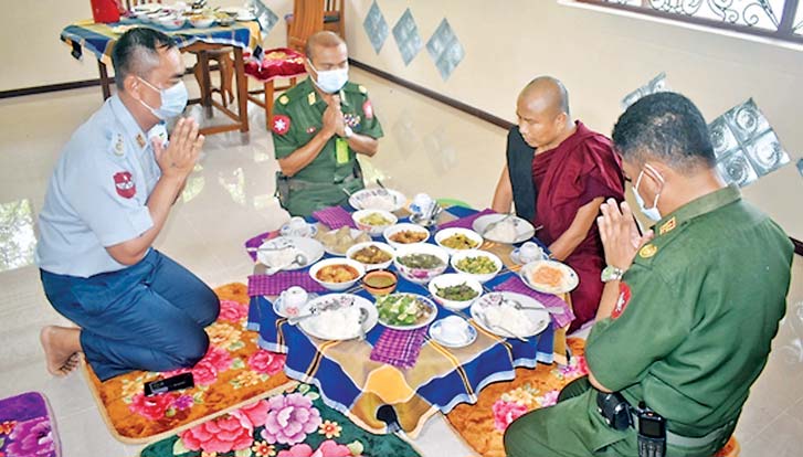 ထိုသို့ ဆောင်ရွက်လျက်ရှိရာ ယနေ့နံနက်ပိုင်းတွင် မွန်ပြည်နယ် သထုံမြို့ရှိ ဘုရားခြောက်ဆူ ပရိယတ္တိစာသင်တိုက်၊ ရန်ကုန်တိုင်းဒေသကြီး အင်းစိန်မြို့နယ် စော်ဘွားကြီးကုန်း ရပ်ကွက်ရှိ အသောကာရုံ ရွှေကျင်ကျောင်းတိုက်၊ ဧရာဝတီတိုင်းဒေသကြီး ဟင်္သာတမြို့ရှိ မိုးကောင်း ပရိယတ္တိစာသင်တိုက်၊ ပဲခူးတိုင်းဒေသကြီး၊ တောင်ငူမြို့ရှိ ဝိသုဒ္ဓါရုံသိမ်းဉုးစာသင်တိုက်တို့မှ သံဃာတော်များနှင့် သာသနာ့နွယ်ဝင် သီလရှင်များအား ဆွမ်းဆန်တော်၊ ဆီ၊ ဆား၊ ပဲ အမယ်လေးမျိုး၊ ကိုဗစ်-၁၉ ရောဂါ ကာကွယ်ရေး အထောက်အကူပြု ပစ္စည်းများနှင့် လှူဖွယ်ပစ္စည်းများကိုလည်းကောင်း၊ ဧရာဝတီတိုင်းဒေသကြီး ကွင်းကောက်မြို့ရှိ ဓမ္မဒူတနိဗ္ဗိန္ဒ တောရကျောင်းတိုက်နှင့် ပဲခူးတိုင်းဒေသကြီး၊ တောင်ငူမြို့ရှိ ဝိသုဒ္ဓါရုံသိမ်းဉုး စာသင်တိုက်တို့မှ သံဃာတော်များနှင့် သာသနာ့နွယ်ဝင် သီလရှင်များအား နေ့ဆွမ်းများကိုလည်းကောင်း သက်ဆိုင်ရာ တိုင်းစစ်ဌာနချုပ်များအလိုက် တိုင်းမှူးများနှင့် တာဝန်ရှိသူများက သွားရောက်၍ ဆက်ကပ်လှူဒါန်းခဲ့ကြောင်း သတင်းရရှိသည်။