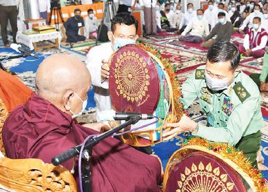 ဦးစွာ နိုင်ငံတော်သံဃမဟာနာယကအဖွဲ့ အကျိုးတော်ဆောင်၊ သန်လျင်မင်းကျောင်း ဆရာတော် အဂ္ဂမဟာပဏ္ဍိတ၊ အဂ္ဂမဟာ သဒ္ဓမ္မဇောတိကဓဇ ဒေါက်တာ ဘဒ္ဒန္တ စန္ဒိမာ ဘိဝံသထံမှ နိုင်ငံတော်စီမံအုပ်ချုပ်ရေးကောင်စီဥက္ကဋ္ဌ တပ်မတော်ကာကွယ်ရေး ဦးစီးချုပ်နှင့် အခမ်းအနား တက်ရောက်လာကြသည့် ဧည့်ပရိသတ်များက ငါးပါးသီလ ခံယူ ဆောက်တည်ကြပြီး နိုင်ငံတော်စီမံအုပ်ချုပ်ရေးကောင်စီဥက္ကဋ္ဌ တပ်မတော် ကာကွယ်ရေးဦးစီးချုပ် ဗိုလ်ချုပ်မှူးကြီး မင်းအောင်လှိုင်၊ နိုင်ငံတော်စီမံအုပ်ချုပ်ရေး ကောင်စီဒုတိယဥက္ကဋ္ဌ ဒုတိယတပ်မတော်ကာကွယ်ရေးဦးစီးချုပ် ကာကွယ်ရေး ဦးစီးချုပ် (ကြည်း) ဒုတိယဗိုလ်ချု်ပမှူးကြီး စိုးဝင်း၊ သာသနာရေးနှင့်ယဉ်ကျေးမှု ဝန်ကြီးဌာန ပြည်ထောင်စုဝန်ကြီး ဦးကိုကိုနှင့် ဥပါသကာများက ဆရာတော်ကြီး၏ ဥတုဇ ရုပ်ကလာပ်တော်အား စိန်ကတ္တီပါလွှမ်း၍ပူဇော်သည်။