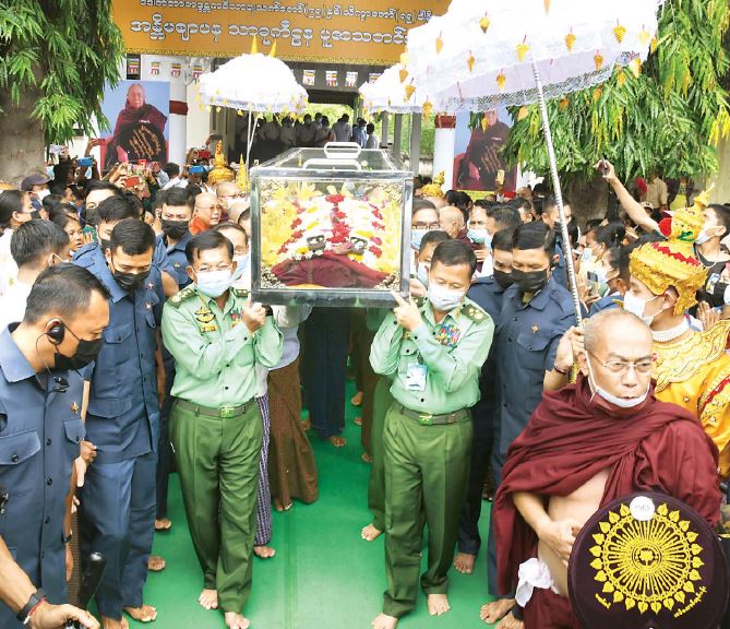 ဆက်လက်ပြီး ရုပ်ကလာပ်တော်အား လောင်တိုက်တော်ပေါ်သို့ ကြွချီတော်မူ ပါမည့်အကြောင်း အဘိယာစန နိမန္တနဂါထာဖြင့် တောင်းပန်လျှောက်ထားပြီး ဆရာတော်ကြီး၏ ရုပ်ကလာပ်တော်အား လောင်တိုက်ပေါ်သို့ အစီအစဉ်အတိုင်း ပင့်ဆောင်ကြသည်။ ထို့နောက် နိုင်ငံတော် စီမံအုပ်ချုပ်ရေးကောင်စီဥက္ကဋ္ဌ၊ ဒုတိယ ဥက္ကဋ္ဌနှင့် အခမ်းအနားတက်ရောက်လာကြသူများက ဆရာတော်ကြီး၏ ရုပ်ကလာပ် တော်အား ဖူးမြော်ကြည်ညိုကြသည်။ ယင်းနောက် သံဃာတော်အရှင်သူမြတ်များ ဦးဆောင်၍ အနိစ္စာ ဝတ သင်္ခါရာ အစချီသော သံဝေဂသုံးဂါထာကို ရွတ်ဆိုပွားများပြီး သာဓုသုံးကြိမ်ခေါ်ဆို၍ ဆရာတော်ကြီး၏ ရုပ်ကလာပ်တော်အား အဂ္ဂိဈာပန တေဇောဓာတ်ဖြင့် ပူဇော်ခဲ့သည်။
