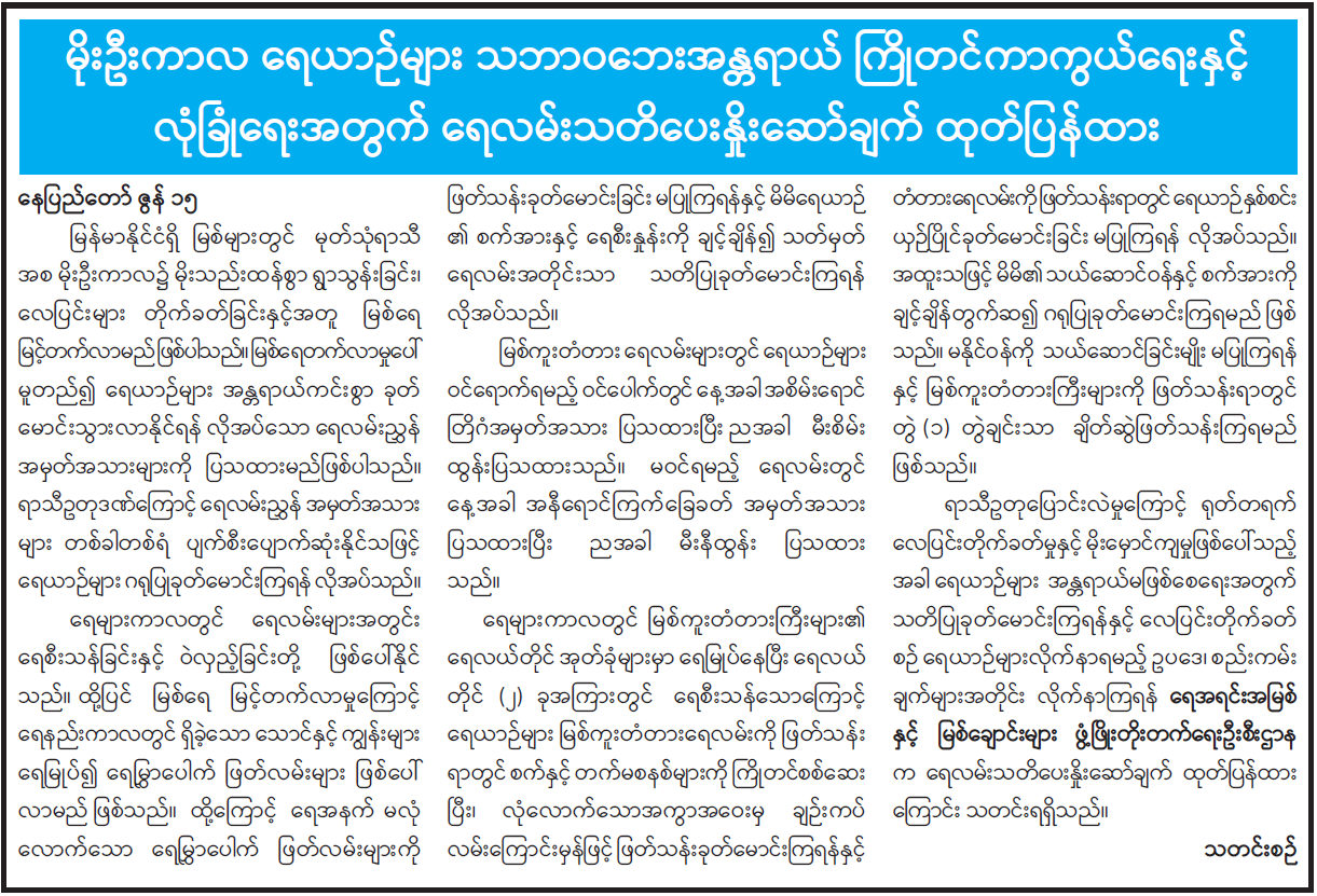 မိုးဦးကာလ ရေယာဉ်များ သဘာဝဘေးအန္တရာယ် ကြိုတင်ကာကွယ်ရေးနှင့် လုံခြုံရေးအတွက် ရေလမ်းသတိပေးနှိုးဆော်ချက် ထုတ်ပြန်ထား 06/16/2021