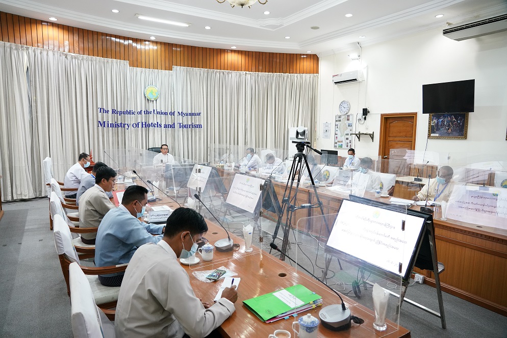 အစည်းအဝေးတွင် ပြည်ထောင်စုဝန်ကြီး ဦးမောင်မောင်အုန်းက ဝန်ကြီးဌာနအနေ ဖြင့် ကိုဗစ်-၁၉ အလွန် ခရီးသွား လုပ်ငန်းပြန်လည် ဖွံ့ဖြိုးတိုးတက်စေရန်အတွက် တိုင်းဒေသ ကြီး/ ပြည်နယ်များတွင် ဟိုတယ်နှင့် ခရီးသွား လုပ်ငန်းများ ပြန်လည်ဖွင့်လှစ်ခြင်း၊ Pilot Project များ ရေးဆွဲအကောင်အထည်ဖော်ဆောင်ရွက်ခြင်းနှင့် ခရီးသွား ဈေးကွက်ရှာဖွေ မြှင့်တင်ခြင်း ပါဝင်သည့် အဆင့် () ဆင့်သတ်မှတ်၍ ဆောင်ရွက်ခဲ့ရာ ပထမအဆင့်ဖြစ်သည့် တိုင်းဒေသကြီး/ ပြည်နယ်များတွင် ဟိုတယ်နှင့်ခရီးသွားလုပ်ငန်းများ ပြန်လည်ဖွင့်လှစ် ဆောင်ရွက်နိုင်ခဲ့ ပါကြောင်း၊ Pilot Project များအနေဖြင့် စက်ဘီးစီးပြိုင်ပွဲကျင်းပခြင်း၊ အထူးဈေးရောင်း ပွဲတော် နှင့် ဖျော်ဖြေရေး အစီအစဉ်များတွင် ခရီးသွားလုပ်ငန်းပါဝင် မြှင့်တင်ဆောင်ရွက်ခြင်း၊ ရိုးရာလှေ ပြိုင်ပွဲ၊ တိုင်းရင်းသားပွဲတော်၊ ခရီးသွား လုပ်ငန်းဖွံ့ဖြိုးတိုးတက်ရေးဆိုင်ရာ အလုပ်ရုံဆွေးနွေးပွဲ များ ကျင်းပရေး စီမံချက်များပါဝင်ကြောင်း၊ ကိုဗစ်-၁၉ ရောဂါကာကွယ်ထိန်းချုပ်နိုင်မှု အခြေအ နေပေါ်မူတည်၍ ခရီးသွားလုပ်ငန်းများ ဆက်လက် အကောင် အထည်ဖော်နိုင်ရေးအတွက် ခရီးစဉ်ဒေသများအလိုက် ဒေသဆိုင်ရာ ခရီးသွားလုပ်ငန်း ကော်မတီ၊ ခရီးစဉ်ဒေသ ဆိုင်ရာ စီမံခန့်ခွဲရေးကော်မတီများ Destination Management Organization (DMOs) များနှင့် နီးနီး ကပ်ကပ် ပူးပေါင်းဆောင်ရွက်ရန်လိုအပ်ကြောင်း။
