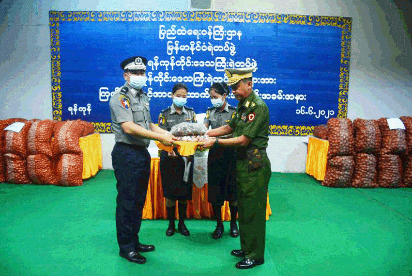 ဦးစွာ  တိုင်းမှူးက အမှာစကားပြောကြားပြီး ရဲတပ်ဖွဲ့ဝင်များအတွက် ဆန် ၂၀၀ အိတ်၊ အာလူး ၁၄၃၈ ပိဿာနှင့် ကြက်သွန်နီ ၁၄၃၈ ပိဿာတို့ကိုပေးအပ်ရာ ရန်ကုန် တိုင်းဒေသကြီးရဲတပ်ဖွဲ့မှူး ရဲမှူးချုပ် မျိုးမင်းထိုက် က လက်ခံ ရယူသည်။