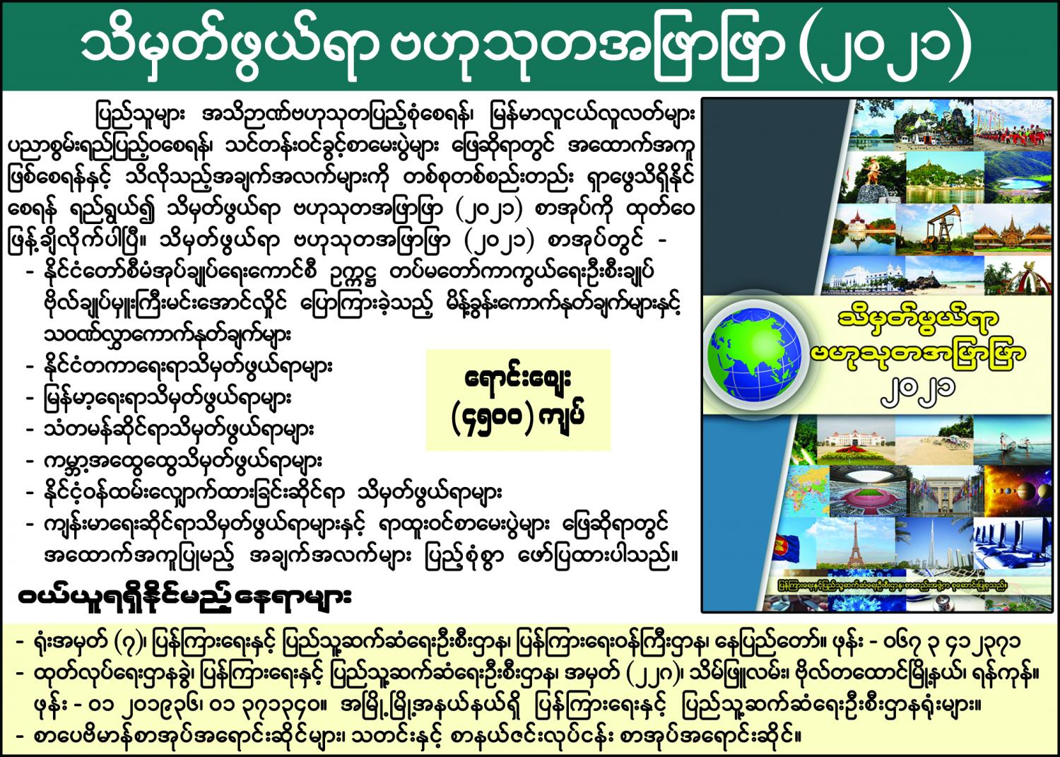 ပြန်ကြားရေးနှင့်ပြည်သူ့ဆက်ဆံရေးဦးစီးဌာနက စီစဉ်ထုတ်ဝေသည့် “သိမှတ်ဖွယ်ရာ ဗဟုသုတ အဖြာဖြာ (၂၀၂၁)” စာအုပ်သည် ပြည်သူများ အသိဉာဏ်ဗဟုသုတပြည့်စုံစေရန်၊ ရာထူးဝင် စာမေးပွဲများ၊ ပြန်တမ်းဝင်ခွင့်စာမေးပွဲများ ဖြေဆိုရာတွင် အထောက်အကူဖြစ်စေရန်နှင့် အခြားသိရှိ လိုသည့် အချက်အလက်များကို တစ်စုတစ်စည်းတည်း ရှာဖွေလေ့လာဖတ်ရှုနိုင်စေရန် ရည်ရွယ်၍ ၂၀၀၈ ခုနှစ်မှ စတင်ကာ နှစ်စဉ်ထုတ်ဝေခဲ့သော စာအုပ်ဖြစ်ပါသည်။