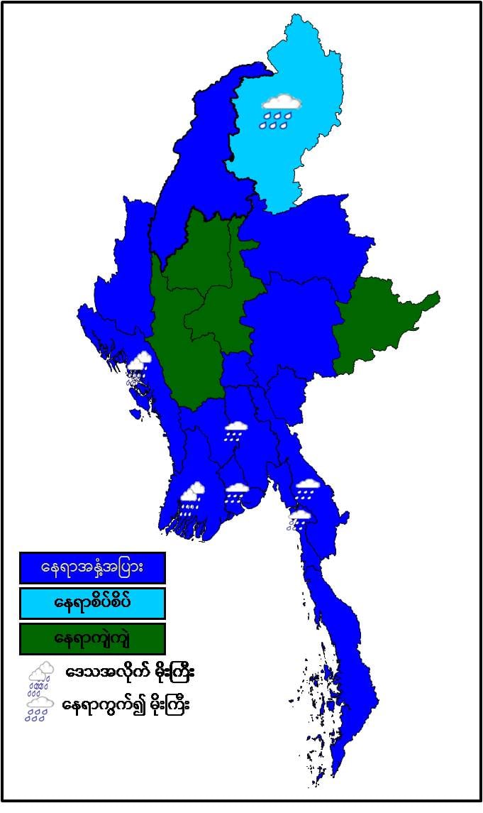 (၂၀၂၁ ခုနှစ်၊ ဇွန်လ (၁၇)ရက်နေ့ မွန်းလွဲ (၂:၀၀)နာရီအချိန် ထုတ်ပြန်ချက်) ယနေ့နံနက်(၀၉:၃၀)နာရီအချိန်ထိမိုးလေဝသတိုင်းထွာချက်အကျဉ်းချုပ်။လွန်ခဲ့သော(၂၄)နာရီအတွင်းကစစ်ကိုင်းတိုင်းဒေသကြီးအောက်ပိုင်း၊ မန္တလေးတိုင်းဒေသကြီး၊ မကွေးတိုင်းဒေသကြီး၊ ကချင်ပြည်နယ်နှင့် ရှမ်းပြည်နယ်(အရှေ့ပိုင်း)တို့တွင် နေရာကျဲကျဲနှင့် ကျန်တိုင်းဒေသကြီးနှင့် ပြည်နယ်တို့တွင် နေရာအနှံ့အပြား မိုးထစ်ချုန်းရွာခဲ့ပြီး၊ ရန်ကုန်တိုင်းဒေသကြီး၊ ဧရာဝတီတိုင်းဒေသကြီး၊ ရခိုင်ပြည်နယ်၊ ကရင်ပြည်နယ်နှင့် မွန်ပြည်နယ်တို့တွင် ဒေသအလိုက်နှင့် နေပြည်တော်၊ ပဲခူးတိုင်းဒေသကြီးနှင့် ကချင်ပြည်နယ်တို့တွင် နေရာကွက်၍ မိုးကြီးခဲ့ပါသည်။ မှတ်သားဖွယ်ရာ မိုးရေချိန်များမှာ သံတွဲမြို့တွင် ‌(၇.၆၈)လက်မ၊ ကျောက်ဖြူမြို့တွင် (၅.၆၃)လက်မ၊ ပိုင်ကျုံမြို့တွင် (၅.၄၉)လက်မ၊ မာန်အောင်မြို့တွင် (၅.၃၅)လက်မ၊ တောင်ကုတ်မြို့တွင် (၄.၉၂)လက်မ၊ မော်လမြိုင်မြို့တွင် (၄.၀၂)လက်မ၊ ကွမ်းခြံကုန်းမြို့တွင် (၃.၈၂)လက်မ၊ ဘီးလင်းမြို့တွင် (၃.၆၂)လက်မ၊ ရှမ်းရွာသစ်မြို့တွင် (၃.၄၆)လက်မ၊ ပူတာအိုမြို့တွင် (၃.၄၃)လက်မ၊ ပဲခူးမြို့၊ မြောင်းမြမြို့၊ မုဒုံမြို့နှင့် ကျိုက္ခမီမြို့တို့တွင် (၃.၃၈)လက်မစီ၊ ရန်ကုန်(မြို့လယ်)တွင် (၃.၃၁)လက်မ၊ ဟိုင်းကြီးကျွန်းမြို့တွင် (၃.၂၇)လက်မ၊ ပုသိမ်မြို့တွင် (၃.၂၃)လက်မနှင့် ဂွမြို့တွင် (၃.၁၉)လက်မ တို့ဖြစ်ကြပါသည်။ ဘင်္ဂလားပင်လယ်အော်အ‌ခြေအနေ။ကပ္ပလီပင်လယ်ပြင်နှင့် ဘင်္ဂလားပင်လယ်အော်တို့တွင် မုတ်သုံလေ အားကောင်းနေပါသည်။ မနက်ဖြန်နံနက်အထိခန့်မှန်းချက်။စစ်ကိုင်းတိုင်းဒေသကြီးအောက်ပိုင်း၊ မန္တလေးတိုင်းဒေသကြီး၊ မကွေးတိုင်းဒေသကြီးနှင့် ရှမ်းပြည်နယ်(အရှေ့ပိုင်း)တို့တွင် နေရာကျဲကျဲ၊ ကချင်ပြည်နယ်တွင် နေရာစိပ်စိပ်နှင့် ကျန်တိုင်းဒေသကြီးနှင့် ပြည်နယ်တို့တွင် နေရာအနှံ့အပြား မိုးထစ်ချုန်းရွာပြီး၊ ဧရာဝတီတိုင်းဒေသကြီးနှင့် ရခိုင်ပြည်နယ်တို့တွင် ဒေသအလိုက်နှင့် ပဲခူးတိုင်းဒေသကြီး၊ ရန်ကုန်တိုင်းဒေသကြီး၊ ကချင်ပြည်နယ်၊ ကရင်ပြည်နယ်နှင့် မွန်ပြည်နယ်တို့တွင် နေရာကွက်၍ မိုးကြီးနိုင်ပါသည်။ ရွာရန်ရာနှုန်းပြည့် ဖြစ်ပါသည်။ မြန်မာ့ပင်လယ်ပြင်။ မြန်မာ့ကမ်းရိုးတန်းတစ်လျှောက်နှင့် ကမ်းလွန်ပင်လယ်ပြင်တို့တွင် တစ်ခါတစ်ရံ မိုးသက်လေပြင်းများကျရောက်ပြီး လှိုင်းကြီးနိုင်ပါသည်။ မိုးသက်လေပြင်းကျစဉ် ရေပြင်/မြေပြင်လေသည် တစ်နာရီလျှင် (၃၅)မိုင်မှ မိုင်(၄၀)အထိ တိုက်ခတ်နိုင်ပါသည်။ လှိုင်းအမြင့်မှာ မြန်မာ့ကမ်းရိုးတန်းတစ်လျှောက်နှင့် ကမ်းလွန်ပင်လယ်ပြင်တို့တွင် (၈)ပေမှ (၁၂)ပေခန့် ရှိနိုင်ပါသည်။ နောက်(၂)ရက်အတွက်ခန့်မှန်းချက်။မုတ