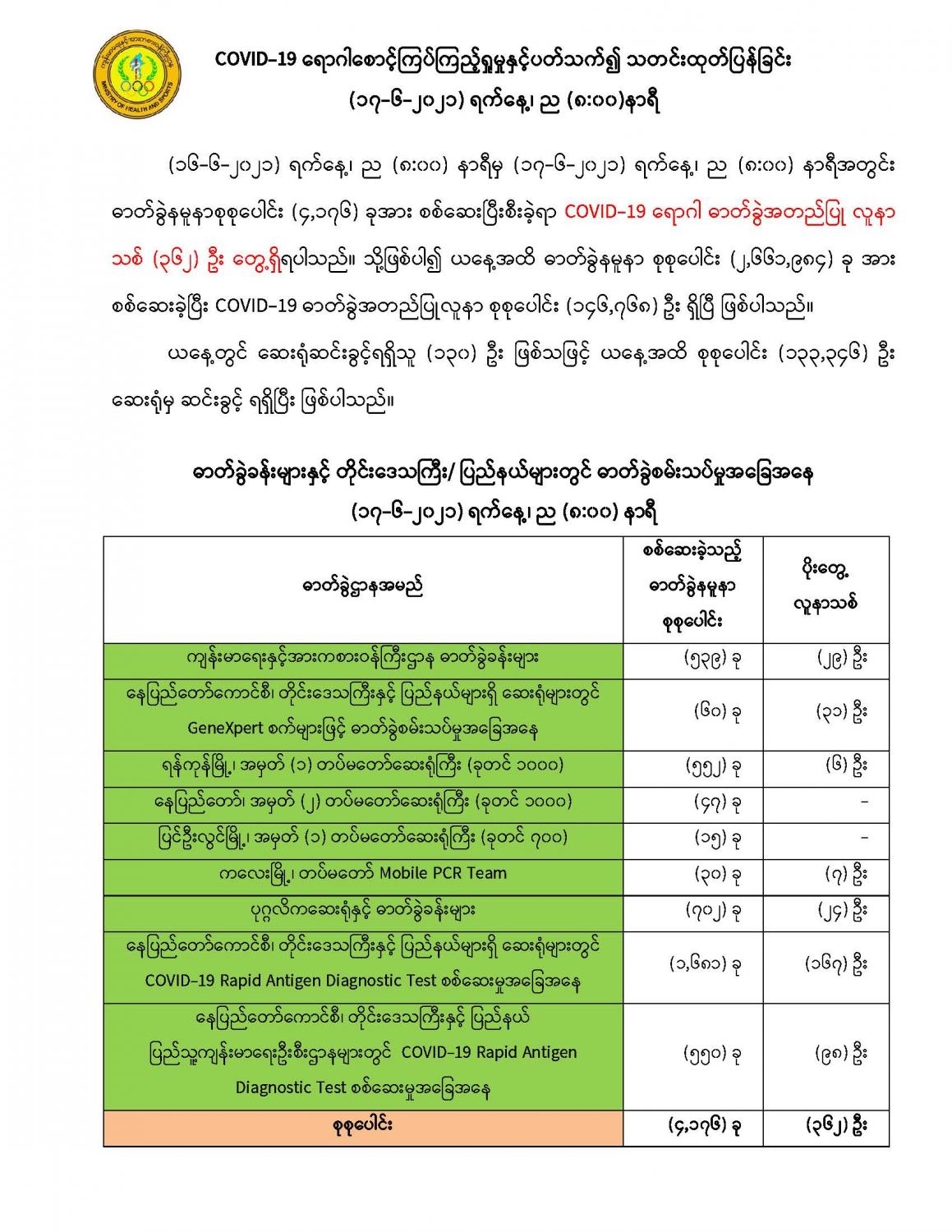 COVID-19 ရောဂါစောင့်ကြပ်ကြည့်ရှုမှုနှင့်ပတ်သက်၍ သတင်းထုတ်ပြန်ခြင်း (၁၇-၆-၂၀၂၁) ရက်နေ့၊ ည (၈:၀၀)နာရီ 06/17/2021