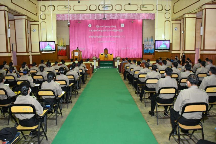 တွေ့ဆုံစဉ် ပြည်ထောင်စုဝန်ကြီးက နိုင်ငံတော်စီမံအုပ်ချုပ်ရေးကောင်စီက ရှေ့လုပ်ငန်းစဉ်များနှင့် ဦးတည်ချက်များ ချမှတ်ကာ လုပ်ငန်းဆောင်ရွက်နေမှုများ၊ နိုင်ငံတော်၏ သတ်မှတ်ထားရှိသည့် မူဝါဒနှင့်အညီ အထွေထွေ အုပ်ချုပ်ရေးဦးစီးဌာနမှ သတ်မှတ်အရည် အချင်းနှင့် ကိုက်ညီသူများကို အုပ်ချုပ်မှုစွမ်းရည် မြင့်မားရေးသင်တန်း အမှတ်စဉ်(၁) အနေဖြင့် ယနေ့မှစတင်၍ သင်တန်းဖွင့်လှစ်ခဲ့ခြင်းဖြစ်ကာ သင်တန်းသား/ သင်တန်းသူများကို ကိုယ်တိုင်ကိုယ်ကျ လာရောက်၍ သိသင့်သိထိုက်သည့် ကိစ္စရပ်များကို လာရောက်မှာကြားခြင်း ဖြစ်ပါကြောင်း၊ လတ်တလော နိုင်ငံတကာတွင် ဖြစ်ပျက်နေသော ဖြစ်စဉ်ဖြစ်ရပ်များကို လေ့လာသုံးသပ်ရမည်ဖြစ်ကြောင်း။ နိုင်ငံဝန်ထမ်းများအနေဖြင့် မည်သည့်အစိုးရ တာဝန်ယူသည်ဖြစ်စေ မိမိတို့ဦးစီးဌာန၏ တာဝန်များ၊ မိမိတို့အတွက် ချမှတ်ပေးထားသော လုပ်ငန်းတာဝန်များကို တာဝန်ကျေ ပွန်စွာ ထမ်းရွက်ကြရန်လို အပ်ကြောင်း၊ ဒို့တာဝန်အရေးသုံးပါးကို အမြဲဂရုပြု ကာကွယ်စောင့် ရှောက်ရမည်ဖြစ်ကြောင်း၊ သင်တန်းသားများကို ရုပ်ပိုင်းဆိုင်ရာနှင့် စိတ်ပိုင်းဆိုင်ရာ ကြံ့ခိုင်မှုများ ရှိစေရေးအတွက် သင်တန်းပို့ချလေ့ကျင့်နိုင်ရန် သင်ရိုးဇယား ရေးဆွဲထားပြီး ကာကွယ် ရေးအမြင်များ ရှိစေရေးအတွက် အခြေခံလိုအပ်သည့် စစ်ပညာဘာသာရပ်များကိုပါ ထည့်သွင်း သင်ကြားနိုင်ရေး လျာထား ဆောင်ရွက်ထားရှိပါကြောင်း၊ ပို့ချသည့်ဆရာ/ဆရာမ များ၏ ပို့ချမှုများကို အလေးထား လိုက်နာကြရန်လိုအပ်ကြောင်း၊ နိုင်ငံအတွင်း အထွေထွေ အုပ်ချုပ်ရေးဦးစီး ဌာန၏ လုပ်ငန်းဆောင်ရွက်ရသည့် လုပ်ငန်းစဉ်များအနေဖြင့် လွန်စွာအရေး ကြီးပါကြောင်း၊ နိုင်ငံတော်အတွင်း ဆူပူဆန္ဒပြရာမှ အဆင့်ဆင့် ဆိုးဝါးလာပြီး မင်းမဲ့စရိုက် ဆန်စွာဖြင့် အုပ်ချုပ်ရေး တာဝန်ရှိသူများကို လုပ်ကြံသတ်ဖြတ်ခြင်း၊ အပြစ်မဲ့ပြည်သူများကို အကြောင်းမဲ့သတ်ဖြတ်ခြင်း၊ ရုံး/ဌာနများကို ဗုံးပစ်ခြင်း၊ မီးရှို့ခြင်း စသည်ဖြင့် အကြမ်းဖက် အဖွဲ့အစည်းပုံသဏ္ဍာန်ကဲ့သို့ လုပ်ရပ်များကို ဆိုးရွားစွာ ဆောင်ရွက်လာသည်ကို တွေ့မြင်ရ ကြောင်း၊ လက်ရှိဖြစ်ပွားနေသည့် ဖြစ်စဉ်ဖြစ်ရပ်များကို ပြည်တွင်း/ပြည်ပ သတင်းမီဒီယာများ အနေဖြင့် မီဒီယာကျင့်ဝတ်ကို မျက်ကွယ်ပြုပြီး ကောလာဟလနှင့် သတင်းအမှားများကိုသာ လုပ်ကြံဖြန့်ချိနေသည်ကို (လူမှုကွန်ယက်) များပေါ်တွင် တွေ့မြင်ရမည်ဖြစ်ကြောင်း၊ ဥပမာ အားဖြင့် ရက်ပိုင်းအတွင်း ဖြစ်ပွားခဲ့သည့် ပေါက်မြို့နယ်၊ ကင်းမကျေးရွာကို အကြမ်းဖက် သောင်းကျန်းသူများမှ မီးရှို့ဖျက်ဆီး ခဲ့မှုအခြေအနေကို သိရှိကြမည်ဖြစ်ကြောင်း၊ မိမိတို့ဝန်ကြီးဌာနအနေဖြင့် တရားဥပဒေ စိုးမိုးရေးနှင့် အစ