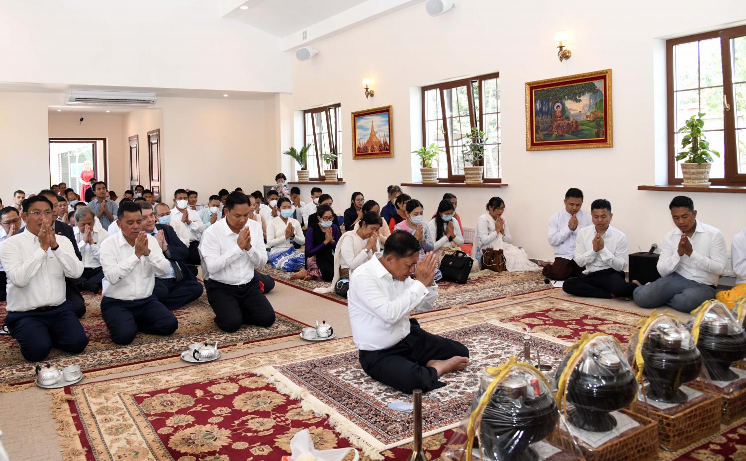 ဆက်လက်၍ နိုင်ငံ တော်စီမံအုပ်ချုပ်ရေးကောင်စီဝင် ဒုတိယဗိုလ်ချုပ်ကြီး မိုးမြင့်ထွန်းနှင့် ကိုယ်စားလှယ်အဖွဲ့ဝင်များက သံဃာတော်အရှင် သူမြတ်များထံသို့ လှူဖွယ်ပစ္စည်းများ ဆက်ကပ် လှူဒါန်းကြသည်။ ယင်းနောက် ကျောင်းထိုင်ဆရာတော် ထံမှ အနုမောဒနာ တရားနာယူကြပြီး လှူဒါန်းမှု အစုစုအတွက် ရေစက်သွန်းချ အမျှပေးဝေခဲ့ကြသည်။