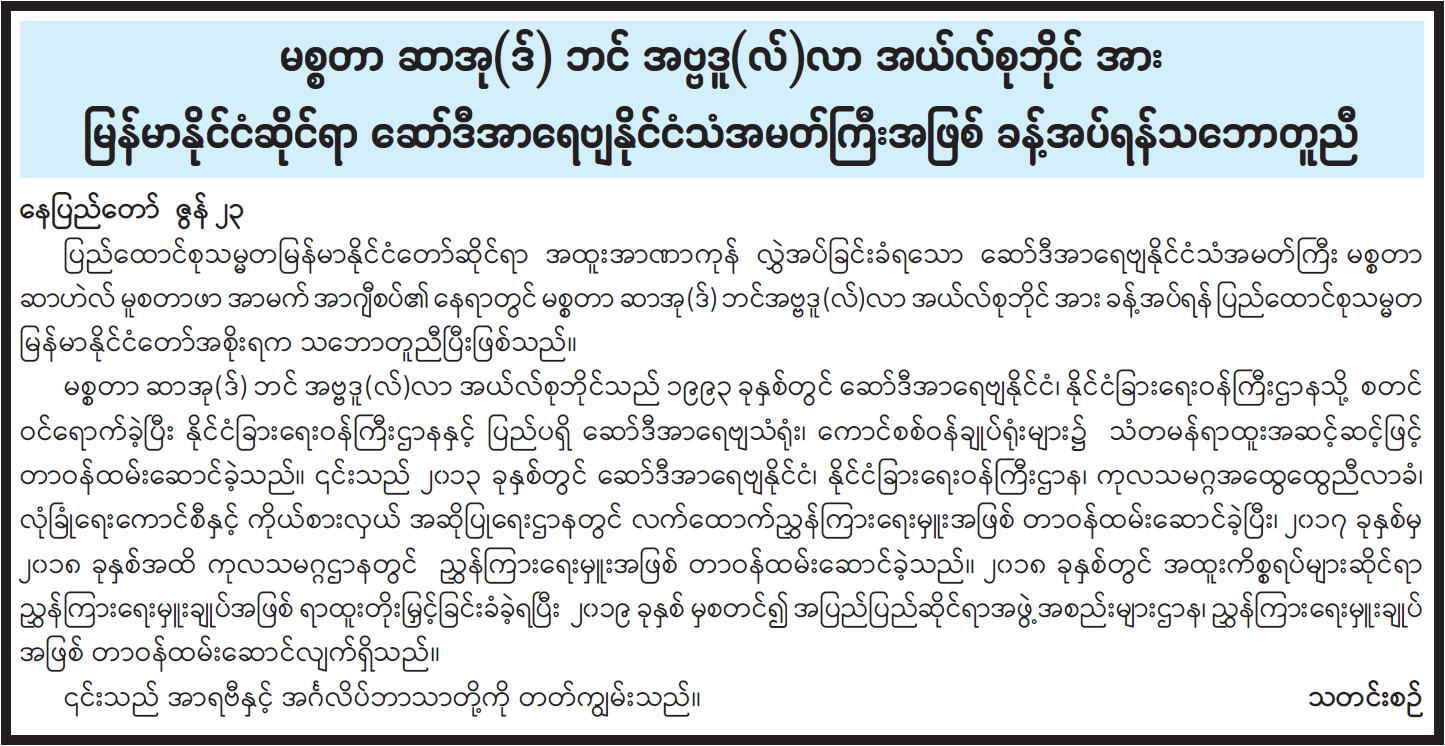 မစ္စတာ ဆာအု(ဒ်) ဘင် အဗ္ဗဒူ(လ်)လာ အယ်လ်စုဘိုင် အား မြန်မာနိုင်ငံဆိုင်ရာ ဆော်ဒီအာရေဗျနိုင်ငံသံအမတ်ကြီးအဖြစ် ခန့်အပ်ရန်သဘောတူညီ 06/23/2021