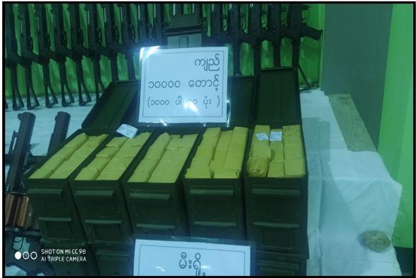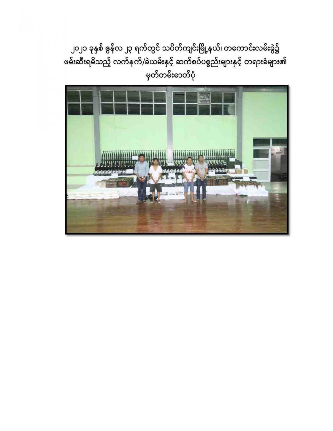 ဖမ်းဆီးရမိတရားခံများအား ဆက်လက်စစ်ဆေးမေးမြန်းချက်အရ လက်နက်/ ခဲယမ်းများအား ၆ ဘီးယာဉ် ၁ စီးဖြင့် သယ်ဆောင်လာကြောင်း သိရှိရသဖြင့် ဖမ်းဆီး ရမိရေးဆောင်ရွက်ခဲ့ရာ ညနေပိုင်းတွင် မန္တလေး-ဗန်းမော် ကားလမ်း မိုင်တိုင် အမှတ်(၂၅)၊ ဝါးရုံကုန်းကျေးရွာ၌ Nissan အမျိုးအစား ယာဉ်အမှတ်၊ 8B-9757 ၆ ဘီးယာဉ်ဖြင့် သယ်ဆောင်လာသော K 2-5 အရှည် ၃၂ လက်၊ K 2-5(ခေါက်ဒင်) ၃၂ လက်၊ M-79 LL ၄၀ လက်၊ 779 Pading III-S ၁၀ လက်၊ စုစုပေါင်း လက်နက်မျိုးစုံ ၁၁၄ လက်၊ ကျည်အိမ် ၂၄၈ ခု၊ K 2-5 ကျည် ၁၀,၀၀၀ တောင့်၊ လက်ပစ်ဗုံး ၄၉၉ လုံး၊ ၄၀ မမ ဗုံးသီး ၁,၄၇၃ လုံး၊ Remote Control မိုင်းအဝေးထိန်းခလုတ် ၃၅ ခု၊ ယမ်းမှုန့်ဟုယူဆ ရသောအထုပ် ၂၅ ထုပ်(၄.၉၆၅ ကီလိုဂရမ်)၊ လွယ်ကြိုး ၁၅၀ ချောင်း၊ လျှပ်စစ်စနက်တံ ၁ ခွေနှင့် ဒီတိုနေတာ ၃ ဖာတို့အား ဖမ်းဆီးရမိခဲ့သည်။
