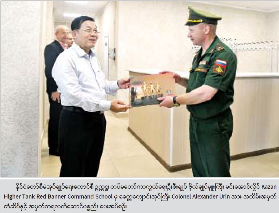 ထို့နောက် နိုင်ငံတော်စီမံအုပ်ချုပ်ရေး ကောင်စီ ဥက္ကဋ္ဌ၊ တပ်မတော်ကာကွယ်ရေး ဦးစီးချုပ်နှင့် ခေတ္တကျောင်းအုပ်ကြီးတို့ သည် အထိမ်းအမှတ်တံဆိပ်နှင့် အမှတ်တရ လက်ဆောင်ပစ္စည်းများ အပြန်အလှန်ပေးအပ်ခဲ့သည်။ အဆိုပါ Kazan Higher Tank Red Banner Command School ကို ၁၉၁၉ ခုနှစ်တွင် စတင်တည်ထောင်ခဲ့ခြင်းဖြစ်ပြီး နှစ်ပေါင်း ၁၀၂ ခန့်ကြာမြင့်ပြီဖြစ်သည့် သမိုင်း အစဉ်အလာ ကြီးမားသည့် သင်တန်းကျောင်းတစ်ခု ဖြစ်ကြောင်း၊ သင်တန်း ကျောင်းတွင် တပ်စုမှူး၊ တပ်ခွဲမှူး၊ တပ်ရင်းမှူး အဆင့်သင်တန်းအထိ သင်ကြား လေ့ကျင့်ပေးလျက်ရှိပြီး ယာဉ်မောင်း နှင်မှုအပြင် အခြားကိုယ်ခန္ဓာကြံ့ခိုင်မှုနှင့် စစ်ပညာ ကျွမ်းကျင်မှု သင်တန်းများကိုပါကို ဘက်စုံ ကျွမ်းကျင်မှုရှိအောင် သင်ကြားလေ့ကျင့် ပေးလျက်ရှိကြောင်း၊ သင်တန်းဆင်းပြီး တင့်တပ်ခွဲမှူး များကို စစ်မြေပြင်တွင် ချက်ချင်း ကွပ်ကဲအုပ်ချုပ်နိုင်သည်အထိ လေ့ကျင့်ပေးထားပြီးဖြစ်ပြီး လိုအပ်ပါက တင့်ကား တပ်ရင်း ခေါင်းဆောင်အဖြစ် ကွပ်ကဲအုပ်ချုပ်နိုင်မည်ဖြစ်ကြောင်းနှင့် အဆိုပါ သင်တန်း ကျောင်းမှ သင်တန်းဆင်းပြီး အရာရှိများသည် အမျိုးမျိုးသော တင့်ကား အမျိုးအစား များကို မောင်းနှင်အသုံးပြုနိုင်မည်ဖြစ်ကြောင်းနှင့် ကွပ်ကဲအုပ်ချုပ်မှု ကောင်းသည့် ခေါင်းဆောင်များအဖြစ် တာဝန်ထမ်းဆောင်နိုင်စေရန် လေ့ကျင့် သင်ကြား မွေးထုတ် ပေးလျက်ရှိကြောင်း၊ ရုရှားတပ်မတော်စစ်ဦးစီးချုပ် Army General V.V Gerasimov တက်ရောက်အောင်မြင်ခဲ့သည့် သင်တန်းကျောင်းလည်းဖြစ်ပြီး သင်တန်းဆင်းအရာရှိများ အနက်မှ ဗိုလ်ချုပ်အဆင့်အထက်အရာရှိ ဦးရေ ၁၀၀ ကျော်နှင့် သူရဲကောင်း ဘွဲ့ရရှိသူ ၁၀ ဦးအထိရှိပြီဖြစ်ကြောင်း သတင်းရရှိသည်။