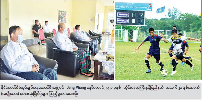 ကျန်းမာရေးနှင့် အားကစားဝန်ကြီးဌာန၊ အားကစားနှင့် ကာယပညာဦးစီးဌာနနှင့် မြန်မာနိုင်ငံ ဘောလုံးအဖွဲ့ချုပ်တို့ ပူးပေါင်းကျင်းပသော ၂၀၂၁ ခုနှစ် တိုင်းဒေသကြီးနှင့်ပြည်နယ် အသက် ၂၁ နှစ်အောက်(အမျိုးသား) ဘောလုံးပြိုင်ပွဲများကို နေပြည်တော်ရှိ ဝဏ္ဏသိဒ္ဓိအားကစား လေ့ကျင့်ရေးကွင်းများ၌ ကျင်းပရာ နိုင်ငံတော်စီမံ အုပ်ချုပ်ရေးကောင်စီ အဖွဲ့ဝင် Jeng Phang နော်တောင်နှင့် ကျန်းမာရေးနှင့်အားကစား ဝန်ကြီးဌာန ဒုတိယဝန်ကြီး ဦးမျိုးလှိုင်တို့ တက်ရောက်ကြည့်ရှုအားပေး ကြသည်။