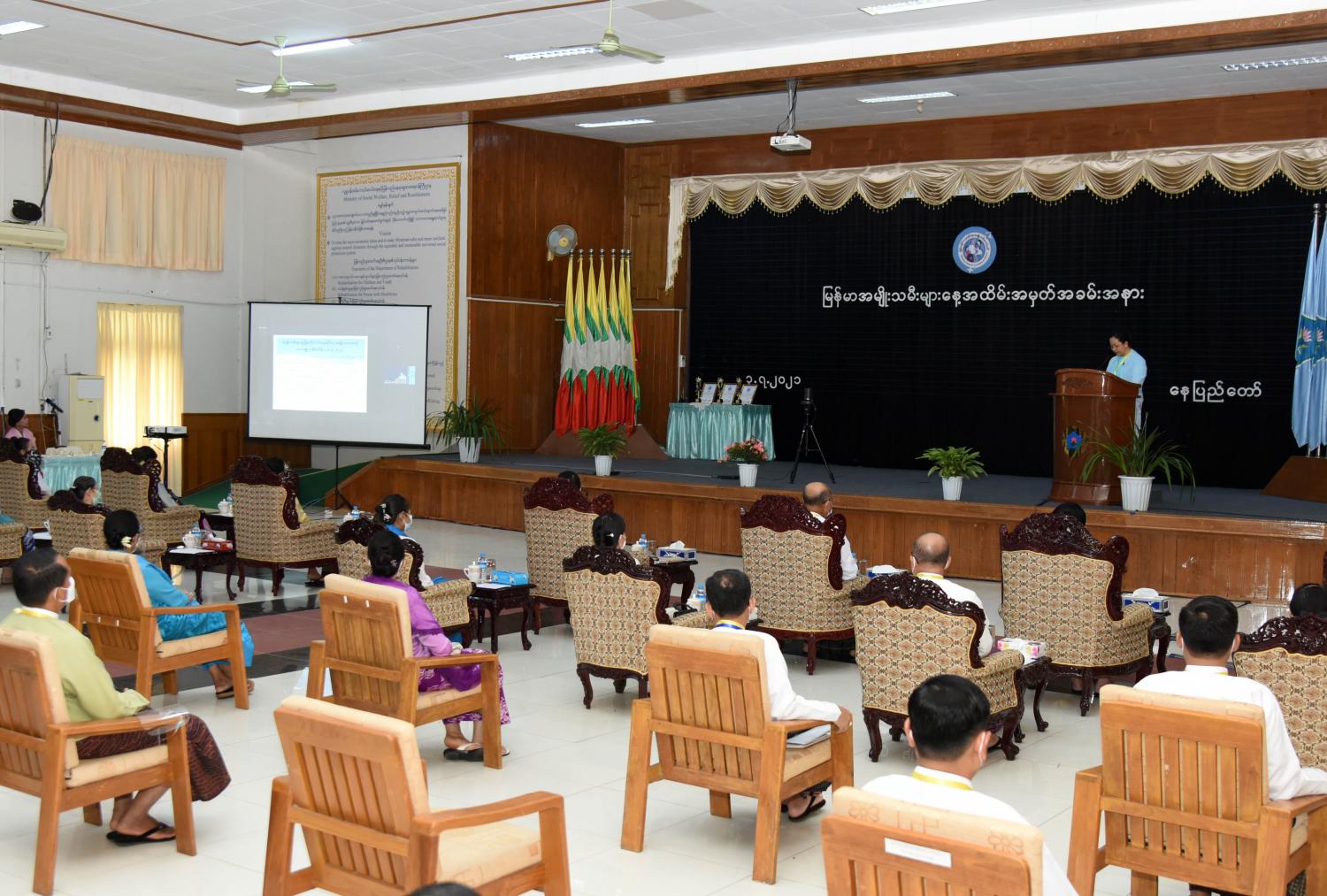 ၂၀၂၁ ခုနှစ် မြန်မာအမျိုးသမီးများနေ့ အထိမ်းအမှတ်အခမ်းအနားကို ယနေ့နံနက် ၁၀ နာရီတွင် နေပြည်တော်ရှိ လူမှုဝန်ထမ်း၊ ကယ်ဆယ်ရေးနှင့် ပြန်လည်နေရာချထားရေးဝန်ကြီးဌာန အစည်းအဝေးခန်းမ၌ COVID-19 ရောဂါ ကာကွယ်၊ ထိန်းချုပ်ရေးဆိုင်ရာ ညွှန်ကြားချက်များနှင့် အညီ ကျင်းပသည်။