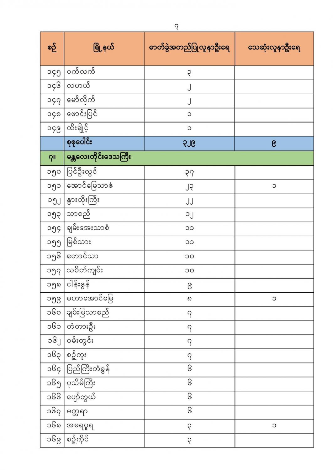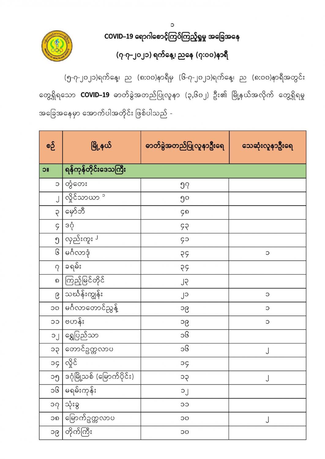 COVID-19 ရောဂါစောင့်ကြပ်ကြည့်ရှုမှု အခြေအနေ (၇-၇-၂၀၂၁) ရက်နေ့၊ ညနေ (၇:၀၀)နာရီ 07/08/2021 (၅-၇-၂၀၂၁)ရက်နေ့၊ ည (၈:၀၀)နာရီမှ (၆-၇-၂၀၂၁)ရက်နေ့၊ ည (၈:၀၀)နာရီအတွင်း တွေ့ရှိရသော COVID-19 ဓာတ်ခွဲအတည်ပြုလူနာ (၃,၆၀၂) ဦး၏ မြို့နယ်အလိုက် တွေ့ရှိရမှု အခြေအနေမှာ အောက်ပါအတိုင်း ဖြစ်ပါသည် -