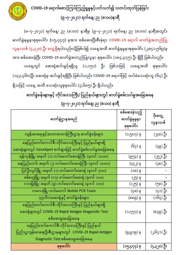 (၈-၇-၂၀၂၁) ရက်နေ့၊ ည (၈:၀၀) နာရီမှ (၉-၇-၂၀၂၁) ရက်နေ့၊ ည (၈:၀၀) နာရီအတွင်း ဓာတ်ခွဲနမူနာစုစုပေါင်း (၁၅,၇၄၇) ခုအား စစ်ဆေးပြီးစီးခဲ့ရာ COVID-19 ရောဂါ ဓာတ်ခွဲအတည်ပြု လူနာသစ် (၄,၃၂၀) ဦး တွေ့ရှိရပါသည်။သို့ဖြစ်ပါ၍ ယနေ့အထိ ဓာတ်ခွဲနမူနာစုစုပေါင်း (၂,၈၄၁,၅၆၉)ခု အား စစ်ဆေးခဲ့ပြီး COVID-19 ဓာတ်ခွဲအတည်ပြုလူနာ စုစုပေါင်း (၁၈၄,၃၇၅) ဦး ရှိပြီ ဖြစ်ပါသည်။