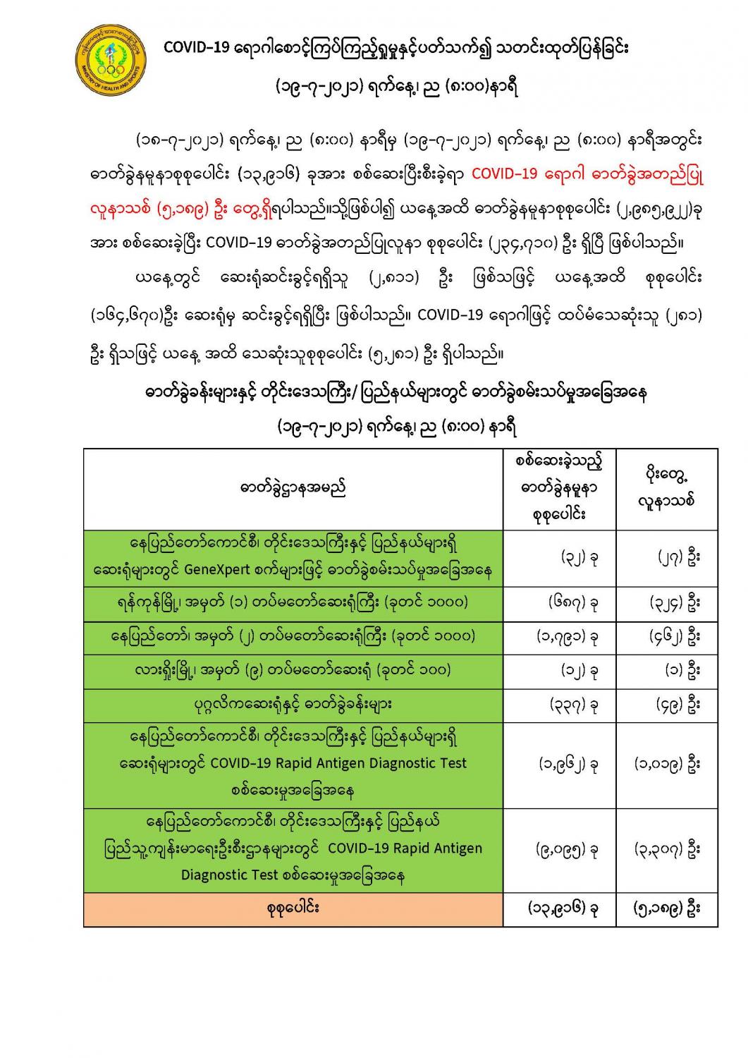 COVID-19 ရောဂါစောင့်ကြပ်ကြည့်ရှုမှုနှင့်ပတ်သက်၍ သတင်းထုတ်ပြန်ခြင်း (၁၉-၇-၂၀၂၁) ရက်နေ့၊ ည (၈:၀၀)နာရီ 07/19/2021