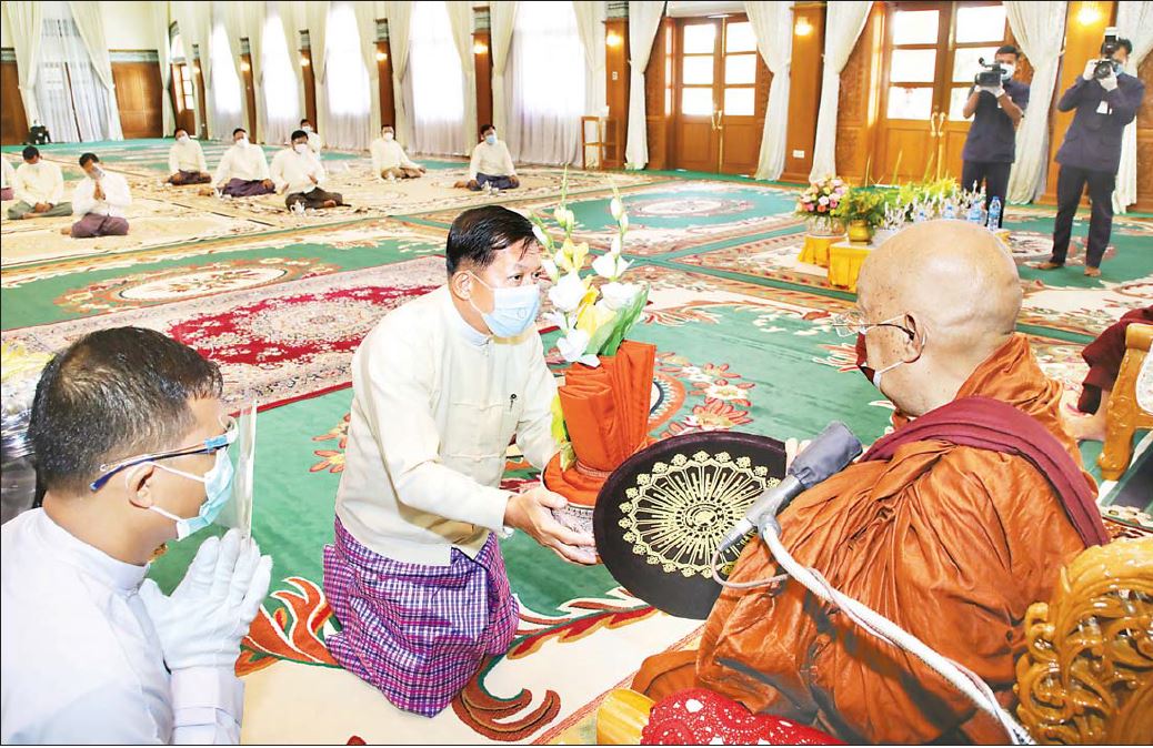 ဦးစွာ နိုင်ငံတော်စီမံအုပ်ချုပ်ရေးကောင်စီဥက္ကဋ္ဌ တပ်မတော်ကာကွယ်ရေးဦးစီးချုပ် က အနော်ရထာခန်းမအတွင်းရှိ ဗုဒ္ဓရုပ်ပွားတော်မြတ်အား ဖူးမြော်ကြည်ညို၍ မြသပိတ်ဆွမ်းတော်နှင့် ပန်း၊ ရေချမ်း၊ ဆီမီးတို့ကို ဆက်ကပ်လှူဒါန်းသည်။