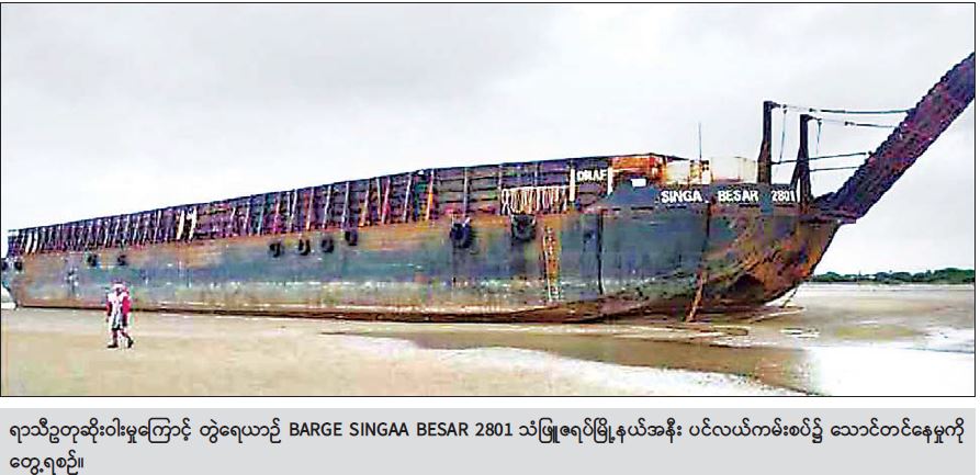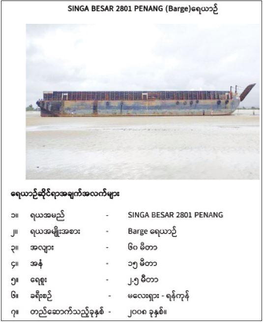 ၁။ တွဲဆွဲရေယာဉ် TUG BRANTAS 1301 မှ ဆွဲလာသော တွဲရေယာဉ် BARGE SINGAA BESAR 2801 သည် ၂၀၂၁ ခုနှစ် ဇူလိုင်လ ၆ ရက်နေ့ တွင် မလေးရှားနိုင်ငံ၊ လူမွတ်(Lumut) ဆိပ်ကမ်းမှ ကွန်ကရစ်ပိုင်တိုင် (Spun Concrete Piles) ၄၆၆ တိုင် (မက်ထရစ်တန် ၂၆၈၁ တန်ခန့်)ကို တင်ဆောင်၍ ထွက်ခွာခဲ့ရာ ရန်ကုန်ဆိပ်ကမ်း၊ သီလဝါတံတားသို့ ၂၀၂၁ ခုနှစ် ဇူလိုင်လ ၂၁ ရက်နေ့ နံနက်ပိုင်းတွင် ဝင်ရောက်ဆိုက်ကပ်ရန် စီစဉ်ဆောင်ရွက်ခဲ့သော်လည်း ရာသီဥတု ဆိုးရွားမှုကြောင့် တွဲဆွဲရေယာဉ်နှင့် (TUG & BARGE) Ops သံဖြူဇရပ်မြို့နယ်၊ ပငကျေးရွာ၏ အနောက်ဘက် (၄)မိုင်ခန့်အကွာရှိ ပင်လယ်ကမ်းစပ်၊ ခန့်မှန်း (အယ်တီ ၆၀၈၅၆၀)၌ ရာသီဥတုဒဏ် ခိုလှုံနေစဉ် ၂၀၂၁ ခုနှစ် ဇူလိုင်လ၂၂ ရက်နေ့ညနေပိုင်းတွင် ရာသီဥတု ပိုမိုဆိုးရွားလာသဖြင့် တွဲဆွဲကြိုး (၂)ချောင်းလုံးပြတ်ကာ တွဲရေယာဉ် BARGE SINGAA BESAR 2801 မှာ မျောပါသောင်တင်မှု ဖြစ်ပွားခဲ့ပါ သည်။