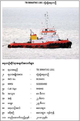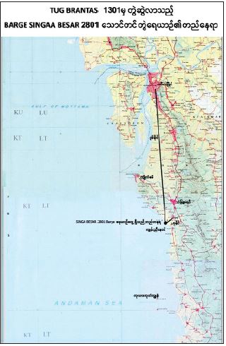 ၂။ သောင်တင်သွားသည့်တွဲရေယာဉ် BARGE SINGAA BESAR 2801 ၏ လက်ရှိ တည်နေရာသည် သံဖြူဇရပ်မြို့နယ်။ ပငကျေးရွာ၏ အနောက်တောင်ဘက် (၂ ဒသမ ၅) မိုင်ခန့်အကွာ မြောက်လတ္တီတွဒ် ၁၅ ဒီဂရီ ၅၂-၅ မိနစ်၊ အရှေ့လောင်ဂျီ တွဒ် ၉၇ ဒီဂရီ ၄၁.၈ မိနှစ် နေရာဖြစ်ပြီး တွဲဆွဲရေယာဉ် TUG BRANTAS 1301 မှာ ၎င်း၏တောင်ဘက် (၁)မိုင်ခန့်အကွာ မြောက်လတ္တီတွဒ် ၁၅ ဒီဂရီ ၅၂.၁၉ မိနစ်၊ အရှေ့လောင်ဂျီတွဒ် ၉၇ ဒီဂရီ ၄၁.၃၇ မိနစ်နေရာတွင် ကျောက်ချ အခြေပြုလျက် ရှိပါသည်။ တွဲဆွဲရေယာဉ်နှင့် တွဲရေယာဉ် ပေါ်တွင် အင်ဒိုနီးရှားရေယာဉ်မှူး အပါ အဝင် အင်ဒိုနီးရှားလူမျိုး (၆)ဦးနှင့် မလေးရှားလူမျိုး (၂)ဦး၊ စုစုပေါင်း (၈) ဦးတို့ ပါရှိပါသည်။