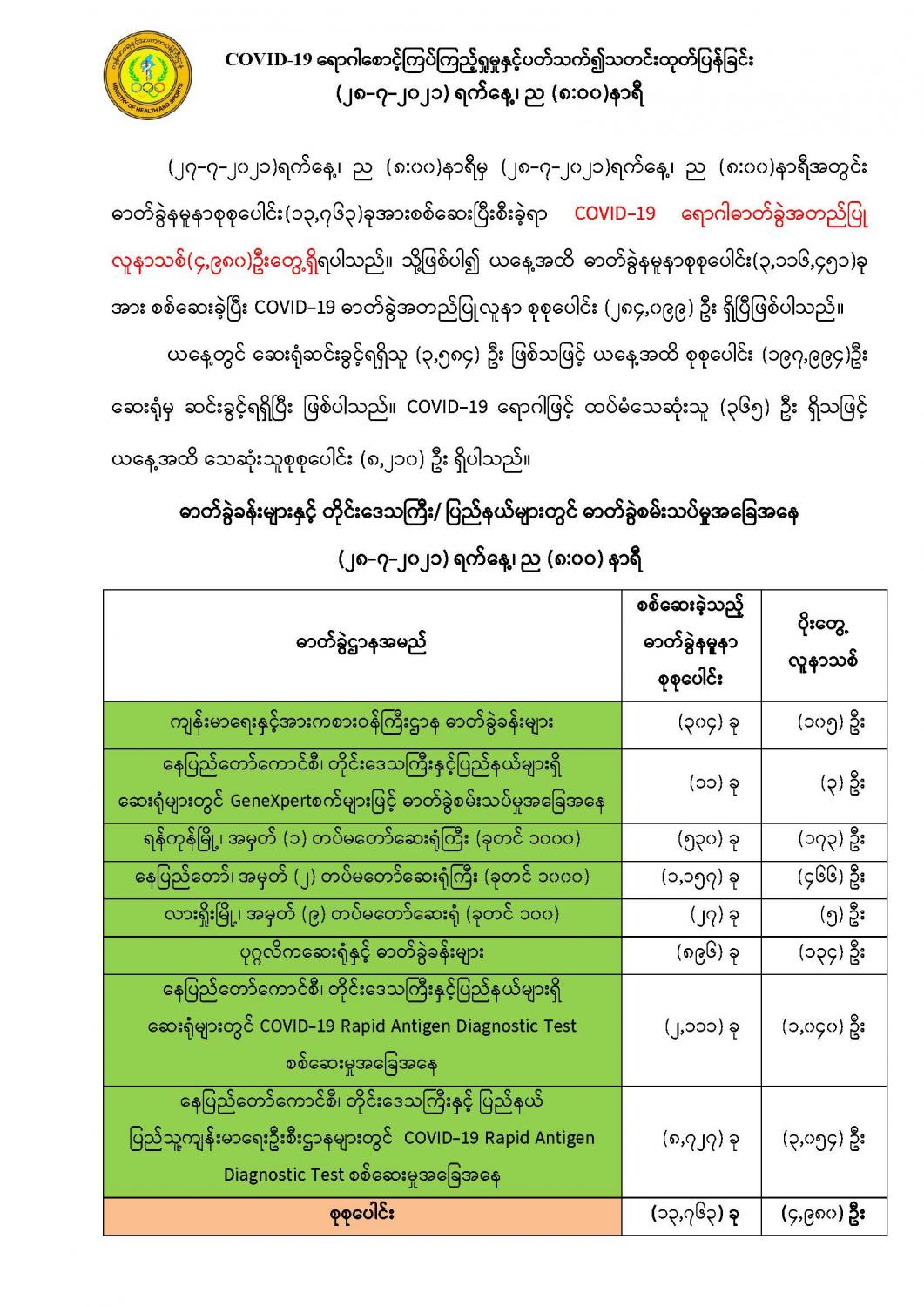 COVID-19 ရောဂါစောင့်ကြပ်ကြည့်ရှုမှုနှင့်ပတ်သက်၍သတင်းထုတ်ပြန်ခြင်း (၂၈-၇-၂၀၂၁) ရက်နေ့၊ ည (၈:၀၀)နာရီ