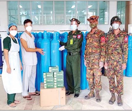 ကိုဗစ်-၁၉ ရောဂါဓာတ်ခွဲအတည်ပြု ပိုးတွေ့လူနာများနှင့် သီးသန့်စောင့် ကြည့်ရမည့်သူများကို ကုသရေးလုပ်ငန်းများ ဆောင်ရွက်ရာတွင် အောက်ဆီဂျင် လိုအပ်ချက်များကို တစ်ဖက်တစ်လမ်းမှ အထောက်အကူပြုစေရန်အတွက် တပ်မတော်နှင့် အလှူရှင်များက အောက်ဆီဂျင်အိုးများ၊ ရောဂါကာကွယ်ရေး အထောက် အကူပြုပစ္စည်းများကို တိုင်းဒေသကြီးနှင့် ပြည်နယ်အသီးသီးရှိ ပြည်သူ့ဆေးရုံများ၊ တပ်မတော်ဆေးရုံများ၊ ကျန်းမာရေးဌာနများ၊ ကိုဗစ်စင်တာများနှင့် လူမှုကူညီရေး အသင်းအဖွဲ့များသို့ ပေးပို့လှူဒါန်းလျက်ရှိသည်။