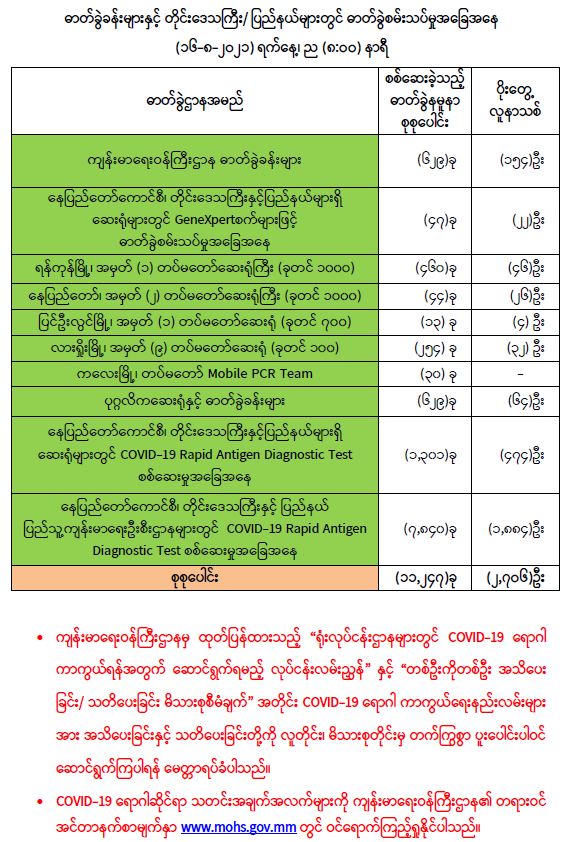 သို့ဖြစ်ပါ၍ ယနေ့အထိ ဓာတ်ခွဲနမူနာစုစုပေါင်း(,၅၈,၂၁၂)ခုအား စစ်ဆေးခဲ့ပြီး COVID-19 ဓာတ်ခွဲအတည်ပြုလူနာ စုစုပေါင်း (၃၅၆,၉၈၅) ဦး ရှိပြီ ဖြစ်ပါသည်။