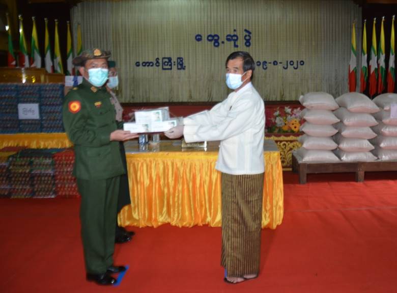 ထိုသို့ပေးအပ်လျက်ရှိရာ ယနေ့တွင် ရှမ်းပြည်နယ်(တောင်ပိုင်း)အတွင်းရှိ စစ်မှု ထမ်းဟောင်းအဖွဲ့ဝင်များအတွက် ဆန်၊ စားသောက်ဖွယ်ရာများနှင့် ကိုဗစ်-၁၉ ရောဂါ ကာကွယ်ရေးအထောက်အကူပြုပစ္စည်းများကို လည်းကောင်း၊ ရှမ်းပြည်နယ် (အရှေ့ပိုင်း)၊ ကျိုင်းတုံမြို့ “အမေ့ရင်ခွင်” ပရဟိတကျောင်းရှိ ကလေးငယ်များအတွက် ဆန်၊ ဆီ၊ စားသောက်ဖွယ်ရာများနှင့် Mask များကိုလည်းကောင်း၊ မန္တလေးတိုင်း ဒေသကြီး၊ မိတ္ထီလာမြို့၊ မင်္ဂလာဇေယျုံကျန်းမာရေးစောင့်ရှောက်ရေးအသင်းနှင့် မြင်းခြံခရိုင် ပြည်သူ့ဆေးရုံနှင့် စဉ့်ကူးမြို့နယ် ပြည်သူ့ဆေးရုံတို့တွင် တက်ရောက် ကုသနေသူများအတွက် အာဟာရဖြည့်စားသောက်ဖွယ်ရာများနှင့် ကိုဗစ်-၁၉ ရောဂါ ကာကွယ်ရေး အထောက်အကူပြုပစ္စည်းများကိုလည်းကောင်း တိုင်းစစ်ဌာနချုပ် အသီးသီးမှ တိုင်းမှူးများ၊ နယ်မြေခံတပ်မတော်သားများ၊ ဌာနဆိုင်ရာ တာဝန်ရှိသူများ နှင့် စေတနာရှင် အလှူရှင်များက အသီးသီးသွားရောက်ထောက်ပံ့လှူဒါန်းကြရာ တာဝန်ရှိသူများက လက်ခံရယူခဲ့ကြကြောင်း သတင်းရရှိသည်။