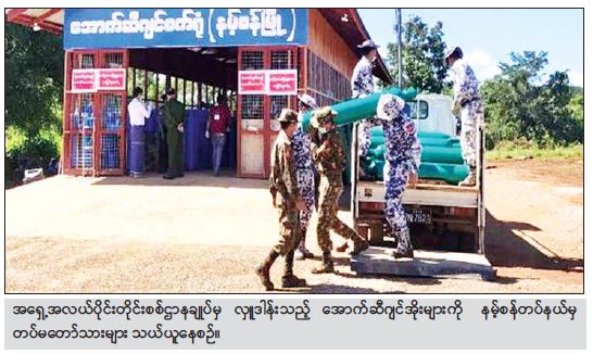 ထို့ပြင် တိုင်းဒေသကြီးနှင့် ပြည်နယ်အသီးသီး၌ အောက်ဆီဂျင် လိုအပ်ချက်များ မရှိစေရေးအတွက် ကျန်းမာရေးဝန်ကြီးဌာနမှ Oxygen Plant များကို တိုးမြှင့်တပ်ဆင် လည်ပတ်လျက်ရှိပြီး တပ်မတော် အနေဖြင့်လည်း တိုင်းစစ်ဌာနချုပ် နယ်မြေအသီးသီးတွင် Oxygen Plant များကို တပ်ဆင်ထုတ်လုပ် ပေးလျက်ရှိရာ ယနေ့တွင် စစ်ကိုင်းတိုင်း ဒေသကြီး၊ ခန္တီးမြို့ခရိုင် ပြည်သူ့ဆေးရုံရှိ အောက်ဆီဂျင်စက်ရုံ စတင်ဖွင့်လှစ်ထုတ်လုပ် နေမှုကို အနောက်မြောက်တိုင်းစစ်ဌာနချုပ်မှ တာဝန်ရှိသူများနှင့် ဌာနဆိုင်ရာ တာဝန်ရှိ သူများက သွားရောက်ကြည့်ရှု၍ လိုအပ်သည်များ ညှိနှိုင်းဆောင်ရွက်ပေးသည်။ အဆိုပါစက်ရုံမှ ထုတ်လုပ်သည့်ပိုလျှံသော အောက်ဆီဂျင်အိုးများကို ဝေးလံခေါင်ဖျား ဒေသဖြစ်သည့် နာဂတောင်တန်းရှိ ဒေသခံတိုင်းရင်းသားပြည်သူများထံသို့ ဆက်လက် ဖြန့်ဖြူးပေးသွားမည် ဖြစ်ကြောင်း သတင်းရရှိသည်။