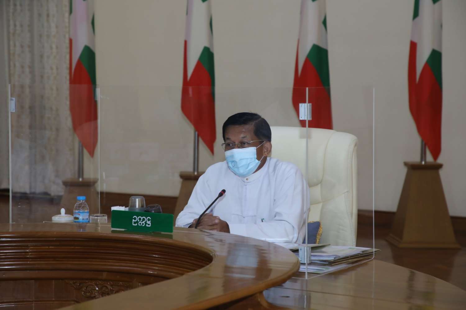 ကိုဗစ် - ၁၉ ရောဂါ ကာကွယ်၊ ထိန်းချုပ်၊ ကုသရေးဆိုင်ရာ (၉)ကြိမ်မြောက် ညှိနှိုင်း အစည်း အဝေးကို ယနေ့နံနက် ၁၀ နာရီတွင် နေပြည်တော်ရှိ ဘုရင့်နောင် ရိပ်သာ အစည်းအဝေး ခန်းမ၌ ကျင်းပပြုလုပ်လျက်ရှိပြီး နိုင်ငံတော်စီမံအုပ်ချုပ်ရေး ကောင်စီဥက္ကဋ္ဌ၊ ပြည်ထောင်စု သမ္မတမြန်မာနိုင်ငံတော် အိမ်စောင့်အစိုးရအဖွဲ့၊ နိုင်ငံတော်ဝန်ကြီးချုပ် ဗိုလ်ချုပ်မှူးကြီး မင်းအောင်လှိုင် တက်ရောက် အမှာစကား ပြောကြားသည်။