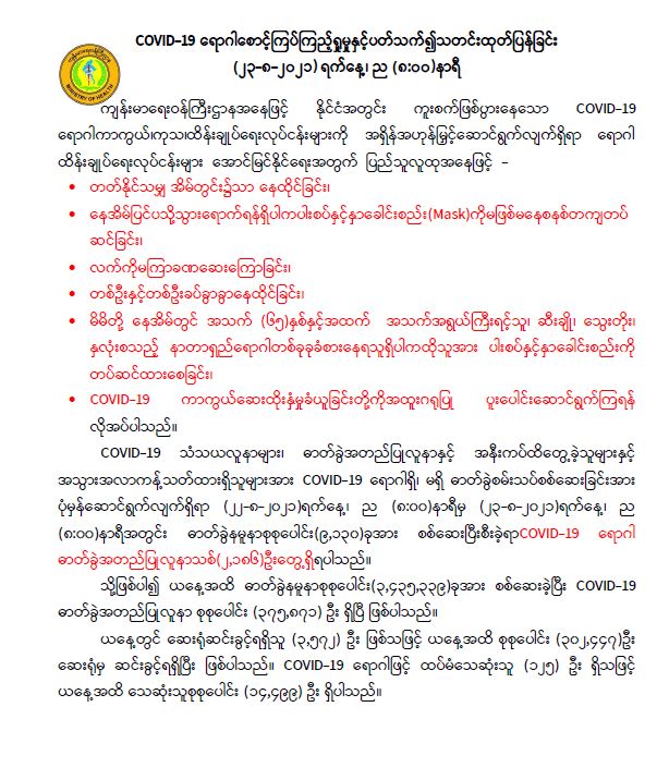 COVID-19 ရောဂါ စောင့်ကြပ်ကြည့်ရှုမှုနှင့် ပတ်သက်၍ သတင်းထုတ်ပြန်ခြင်း (၂၃-၈-၂၀၂၁) ရက်နေ့၊ ည (၈:၀၀)နာရီ