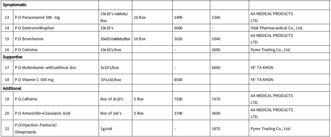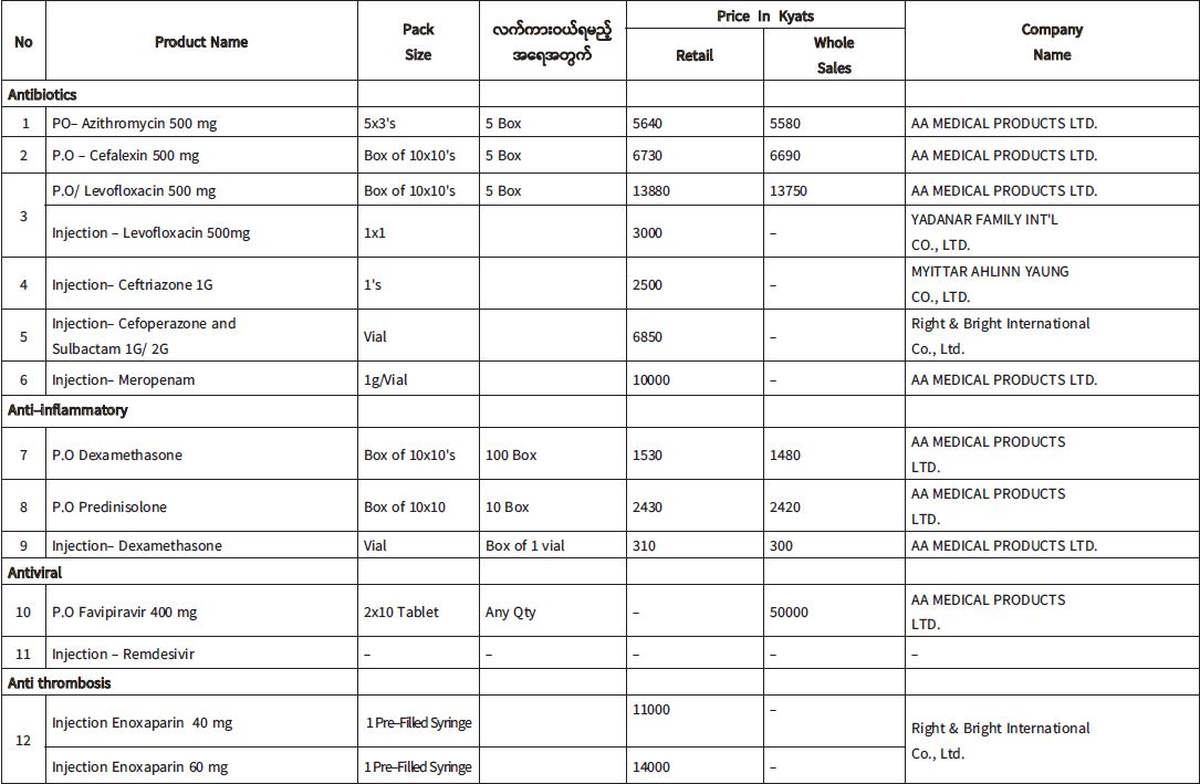 မြန်မာနိုင်ငံ ဆေးနှင့် ဆေးပစ္စည်း လုပ်ငန်းရှင်များအသင်းသည် ကိုဗစ်- ၁၉ ရောဂါ ကာကွယ်၊ ကုသရေးဆိုင်ရာ ဆေးဝါး၊ ဆေးပစ္စည်းမျိုးစုံတို့ကို အများပြည်သူများ ဈေးနှုန်းချိုသာစွာဖြင့် တင်သွင်းသူများထံမှ တိုက်ရိုက်ဝယ်ယူရရှိနိုင်စေရန်အတွက်လည်းကောင်း၊ အရည်အသွေး စစ်မှန်၍ ယုံကြည်စိတ်ချရသော မှတ်ပုံတင်ရှိ ဆေးဝါး၊ ဆေးပစ္စည်းများကို တင်သွင်းသည့် ကုမ္ပဏီများထံမှ တိုက်ရိုက်ဝယ်ယူနိုင်စေရန် အတွက်လည်း ကောင်း၊ အများပြည်သူများ ဆေးဝါး၊ ဆေးပစ္စည်းများ လက်လီဝယ်ယူရာတွင် တင်သွင်းသော ကုမ္ပဏီများမှ ရောင်းဈေးနှင့် နှိုင်းယှဉ်လျှင် အလွန်အမင်းဈေးကြီးပေး၍ ဝယ်ယူနေရခြင်းကို လျှော့ချတားဆီး နိုင်ရန်အတွက် လည်းကောင်း၊ တရားမဝင် Online များမှ အမြတ်ကြီးစားရောင်းချသည့် မှတ်ပုံတင်မရှိသော၊ အရည်အသွေး အာမခံချက်မရှိသော ဆေးဝါး၊ ဆေးပစ္စည်းများကို တားဆီးရာတွင် အထောက်အကူ ဖြစ်စေရန်အတွက် လည်းကောင်း အစရှိသည့်ရည်ရွယ်ချက်ကောင်းများစွာဖြင့် အောက်ဖော်ပြပါ ဆေးဝါးများအား ယှဉ်တွဲပါ ဈေးနှုန်းများအတိုင်း ရောင်းချပေးလျက်ရှိပါသည်။ ၎င်းအပြင် အသင်းဝင်ဆေးဝါးတင်သွင်းသည့် ကုမ္ပဏီများထံမှ မိဘပြည်သူများ တိုက်ရိုက် ချိတ်ဆက်ဝယ်ယူနိုင်စေရန် တင်သွင်းဆေးဝါးများ၏ Price List များအား စုစည်း၍ ယနေ့မှစပြီး တစ်ပတ်လျှင်တစ်ကြိမ် အသင်း၏ Website(www.mccpmd.org)နှင့် Facebook Page https://www.facebook.com/323302521392189/posts/1720802588308835/?d=n များတွင် ကြေညာပေးသွားမည် ဖြစ်ကြောင်း အသိပေးကြေညာအပ်ပါသည်။