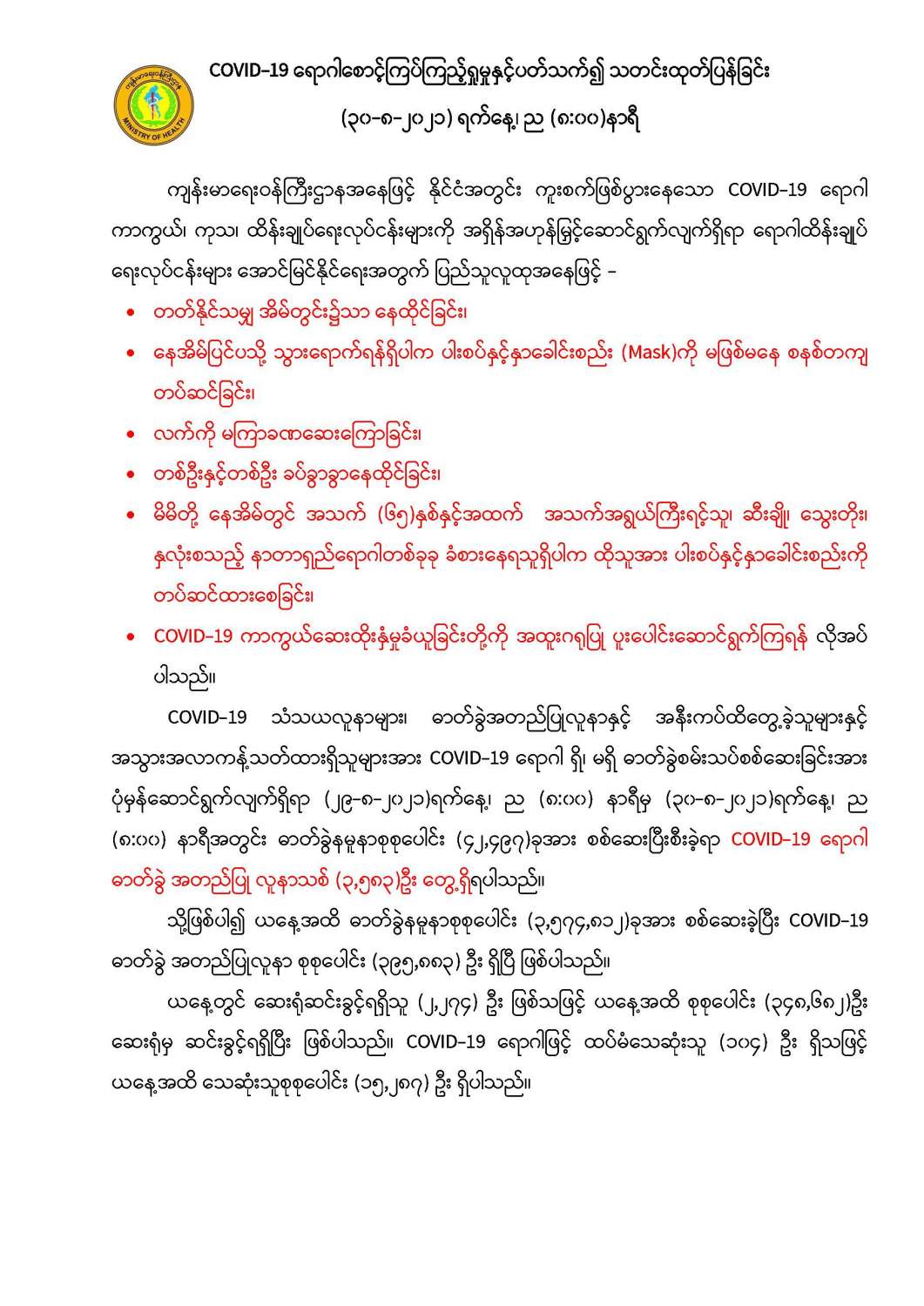 COVID-19 ရောဂါစောင့်ကြပ်ကြည့်ရှုမှုနှင့်ပတ်သက်၍သတင်းထုတ်ပြန်ခြင်း (၃၀-၈-၂၀၂၁) ရက်နေ့၊ ည (၈:၀၀)နာရီ 08/30/2021