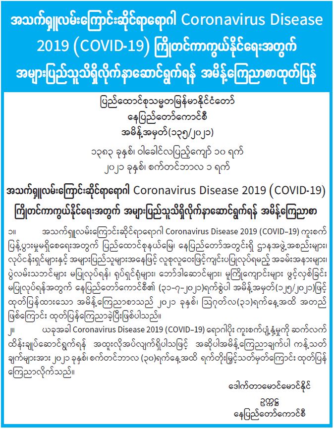 အသက်ရှူလမ်းကြောင်းဆိုင်ရာရောဂါ Coronavirus Disease 2019 (COVID-19) ကြိုတင်ကာကွယ်နိုင်ရေးအတွက် အများပြည်သူသိရှိလိုက်နာဆောင်ရွက်ရန် အမိန့်ကြေညာစာထုတ်ပြန်